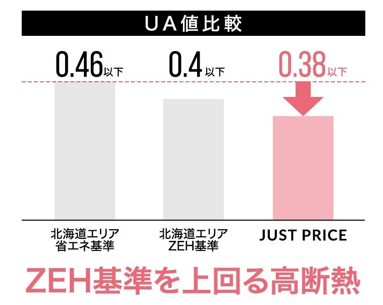 北海道の省エネ基準UA値(熱の逃げやすさを表す数値)0.46だけでなく、ZEH基準0.4も上回る0.38以下の高断熱を実現。
