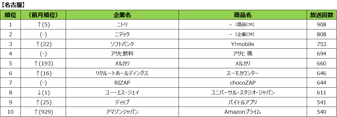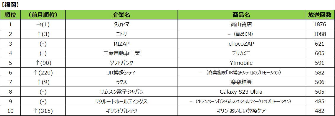 また、2023年3月度のランキング(*)と比べ、新生活開始に合わせて検討・活用されそうな商品のCMが各地区で増加しました。東京地区8位のVISAインターナショナル「VISAデビット」は上京して一人暮らしを始め自分で家計管理をするようになった社会人を、名古屋地区9位のディップ「バイトルアプリ」は大学のスケジュールに合わせてアルバイトを始めようとしている学生を、名古屋地区3位及び福岡地区5位のソフトバンク「Y!mobile」は入学・進学した子に携帯電話を持たせたい親をターゲットにしたCMだと考えられます。
