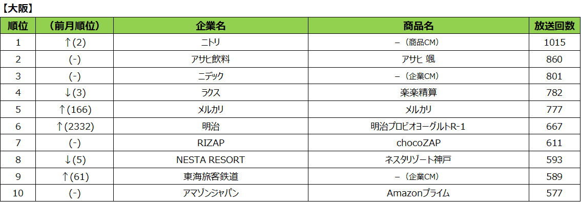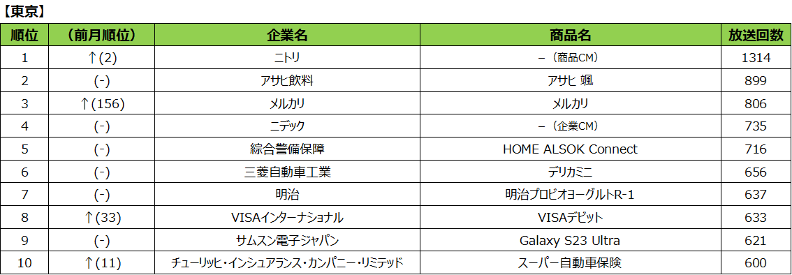 2023年4月度の商品別ランキングは、1位にニトリの商品CM、2位にアサヒ飲料「アサヒ 颯」、3位にメルカリ「メルカリ」となりました。