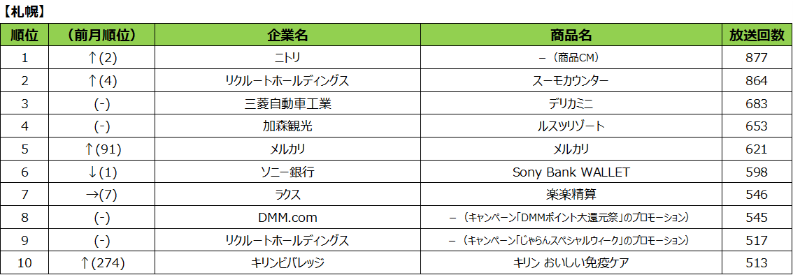 今回のエリア別ランキングには、各地区周辺のレジャー施設のCMがランクインしていました。大阪地区8位にNESTARESORT「ネスタリゾート神戸」、名古屋地区に8位ユー・エス・ジェイ「ユニバーサル・スタジオ・ジャパン」、福岡地区6位にJR博多シティが運営する商業施設「JR博多シティ」のCM、札幌地区4位に加森観光「ルスツリゾート」がランクインしています。新型コロナ関連の規制が緩和された状態で迎えるゴールデンウィークに向け、各施設が周辺地区の住人の集客を図っていたようです。