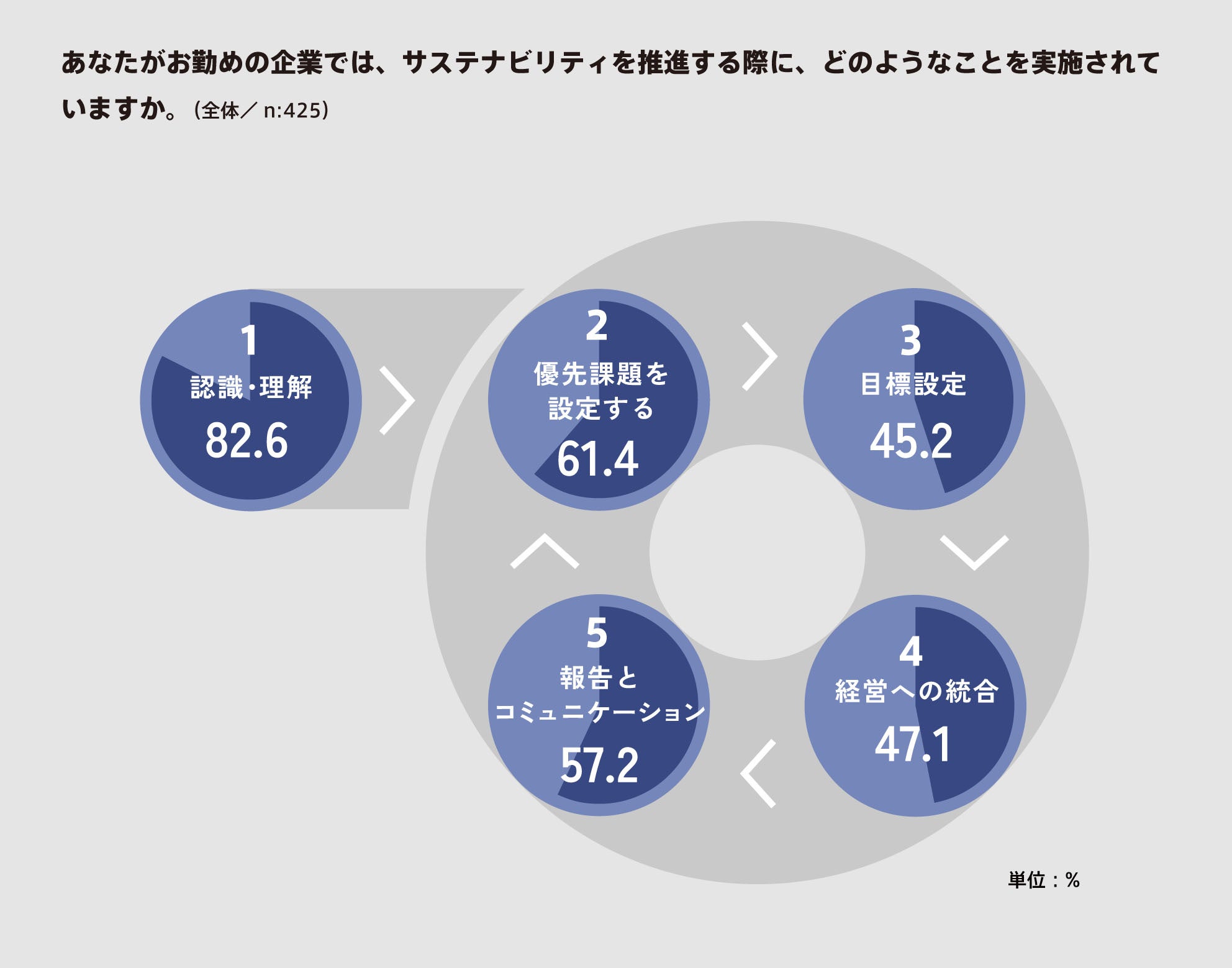 SDGコンパスが提唱する5ステップごとにまとめた実施率は、「認識・理解」で82.6%、「優先課題の特定」で61.4%、「目標設定」で45.2%、「経営への統合」で47.1%、「報告とコミュニケーション」で57.2%。
