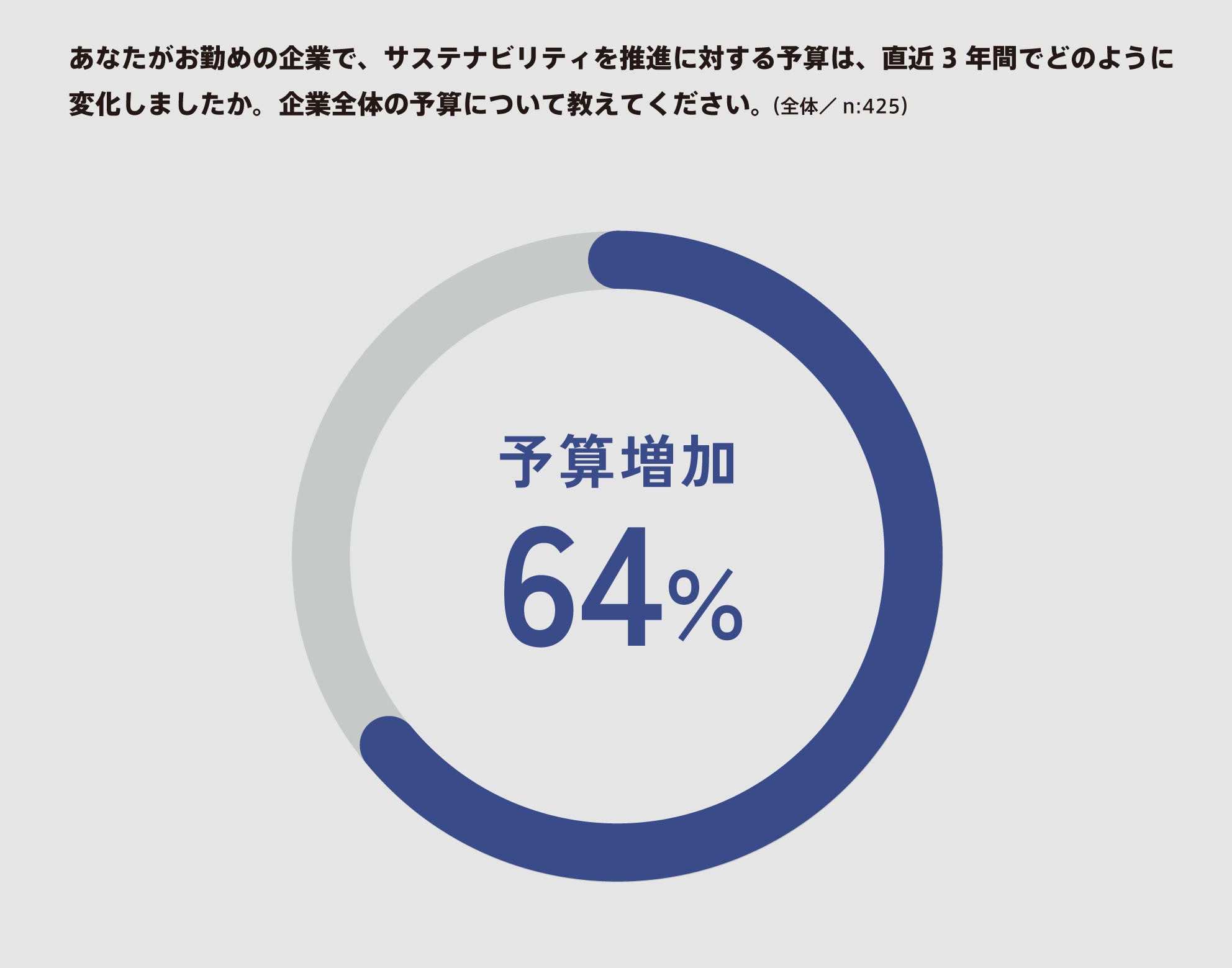 直近3年間のサステナビリティ関連予算について、64.0%が「増えた」と回答。