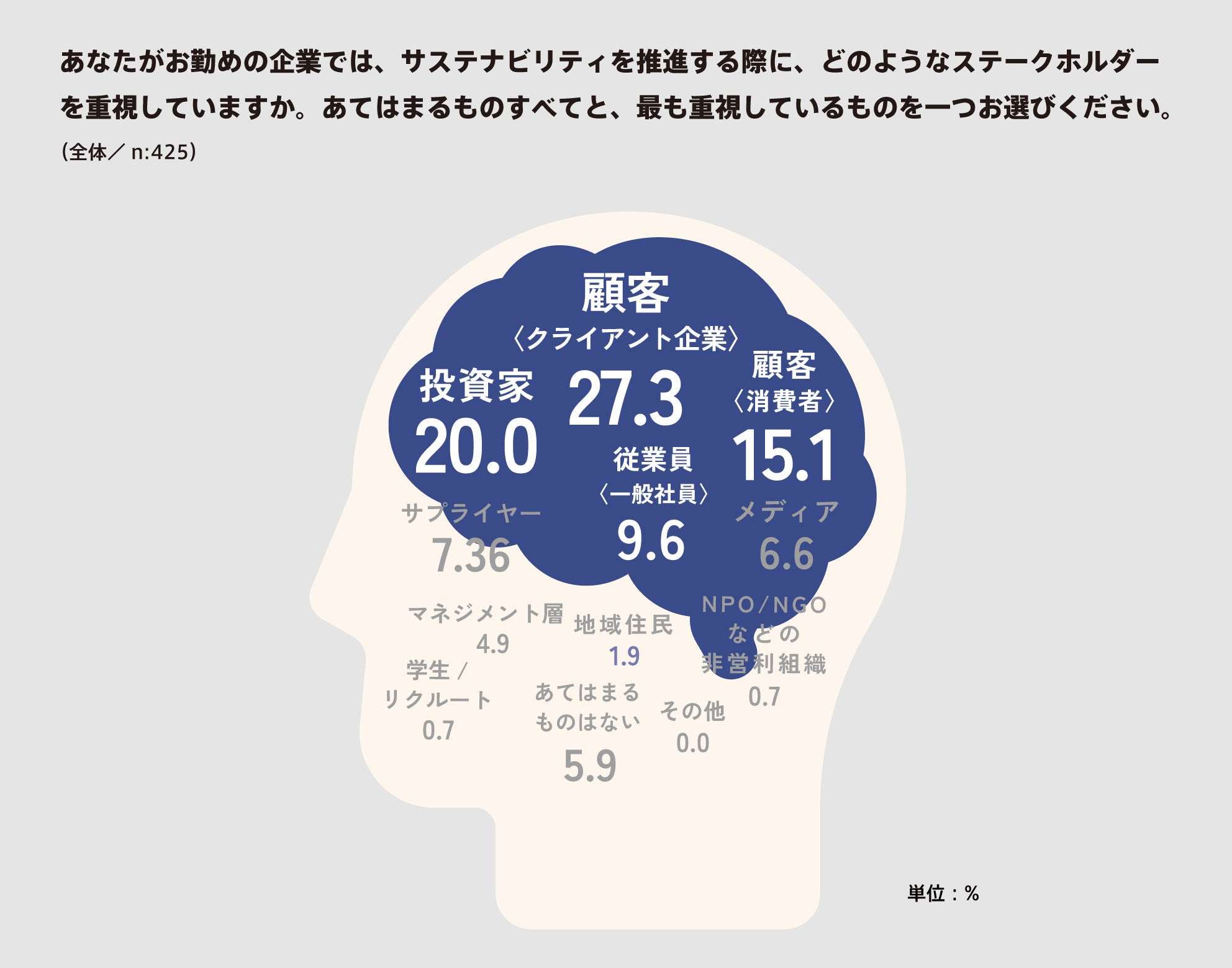 主なものは「顧客(クライアント企業)」(27.3%)、 「投資家」(20.0%)、「顧客(消費者)」(15.1%)、「従業員(一般社員)」(9.6%)。サプライヤー、地域、学生、非営利団体などへの回答も上がり、上場企業/非上場企業ともにマルチステークホルダーへの意識が顕在化。