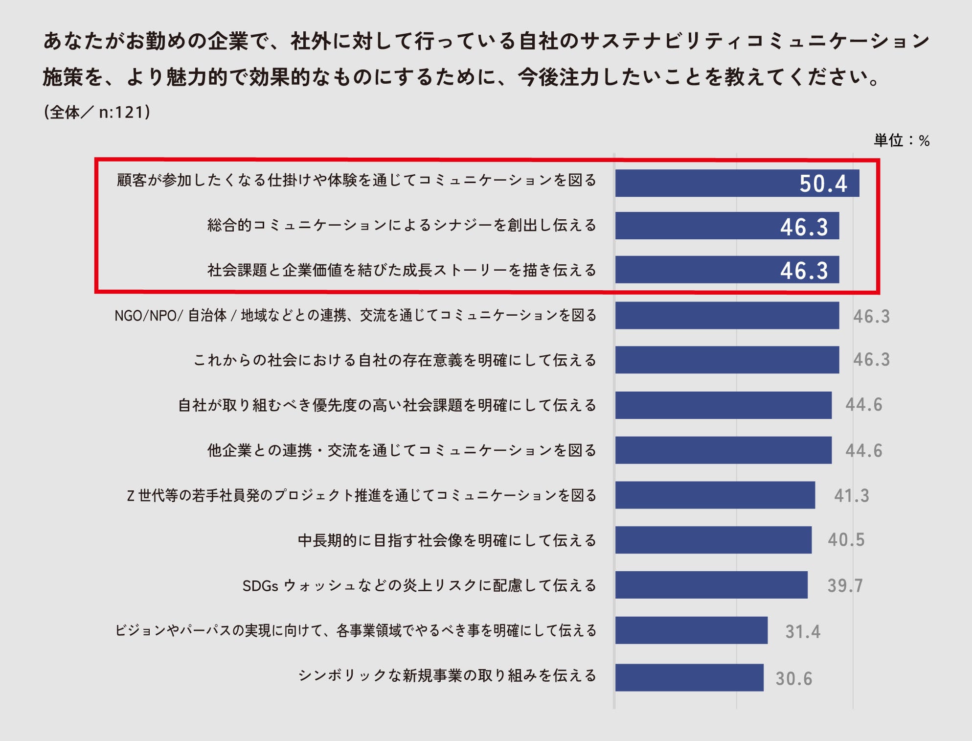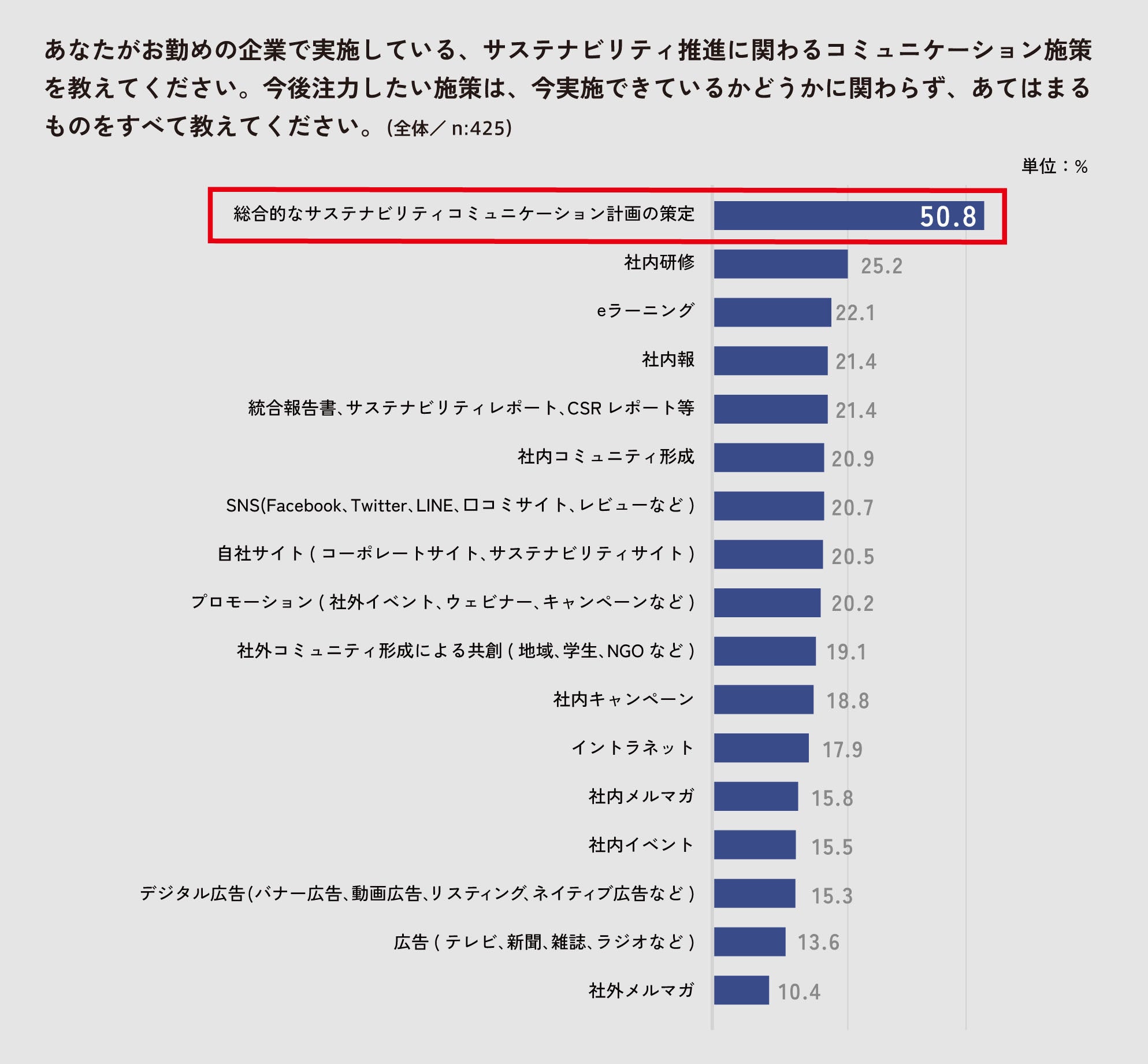 TOP3は、1位「総合的なサステナビリティコミュニケーション計画の策定(50.8%)」、「社内研修(25.2%)」、「eラーニング(22.1%)」。半数以上の企業が今後、「総合的なサステナビリティコミュニケーション計画の策定」に注力したいと回答した。現在、バラバラに実施されているコミュニケーションを統合することで、事業成長や人材獲得につなげたい企業担当者の意図が見て取れる。