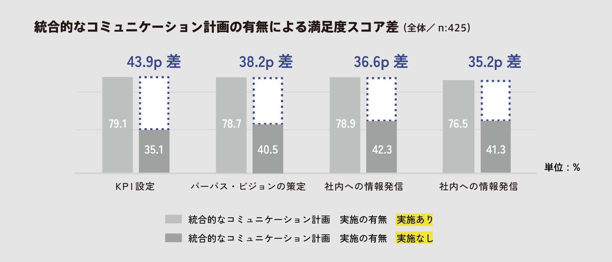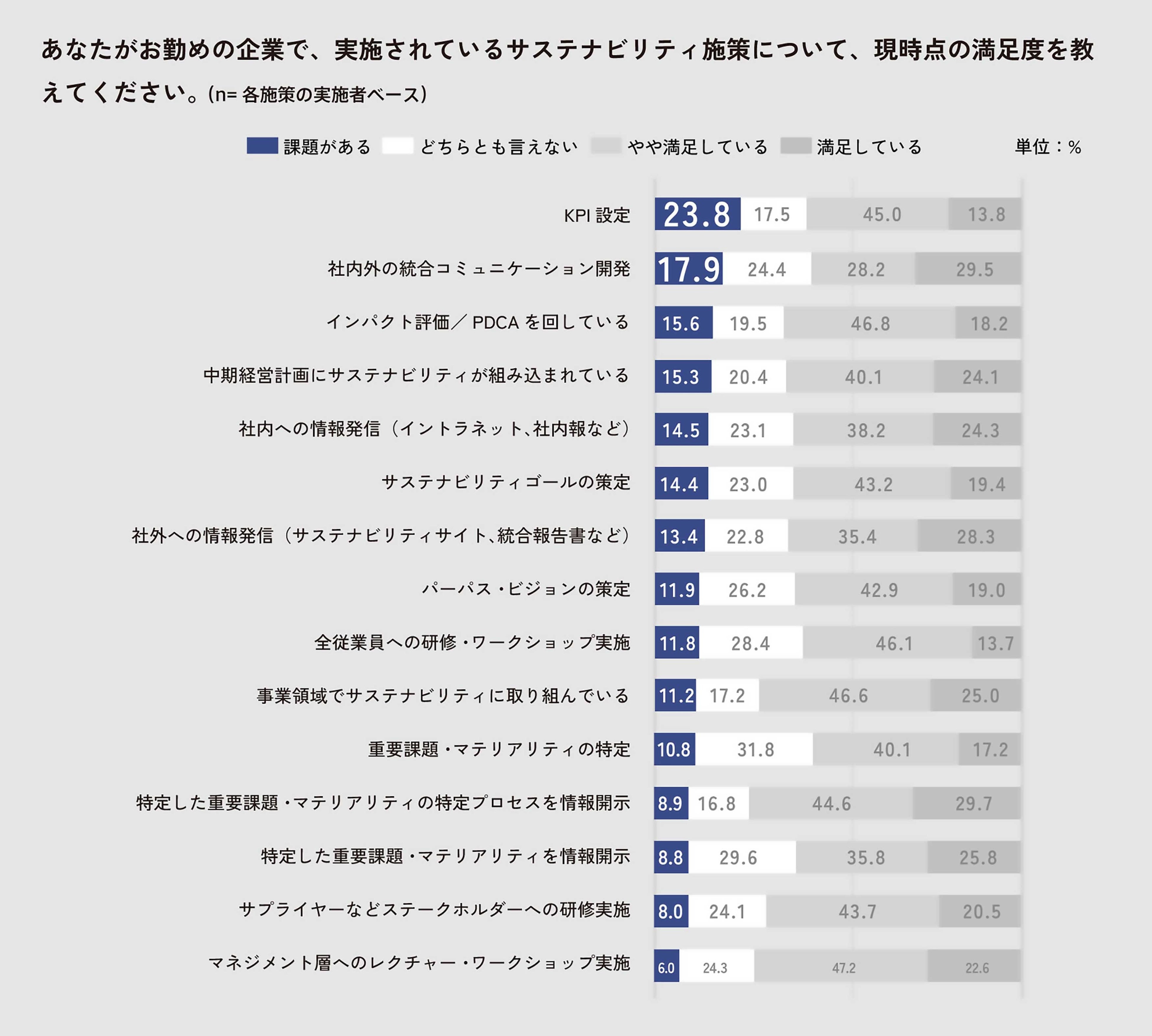 また、総合的なサステナビリティコミュニケーションを実施している層は、未実施層と比べ、全般的に満足度が高く、特に「KPI設定」「パーパス・ビジョン策定」「社内外への情報発信」に対する満足度スコアが35pt以上高く、統合的なコミュニケーション計画」の実施によって、取り組みの成果を実感できることがわかった。