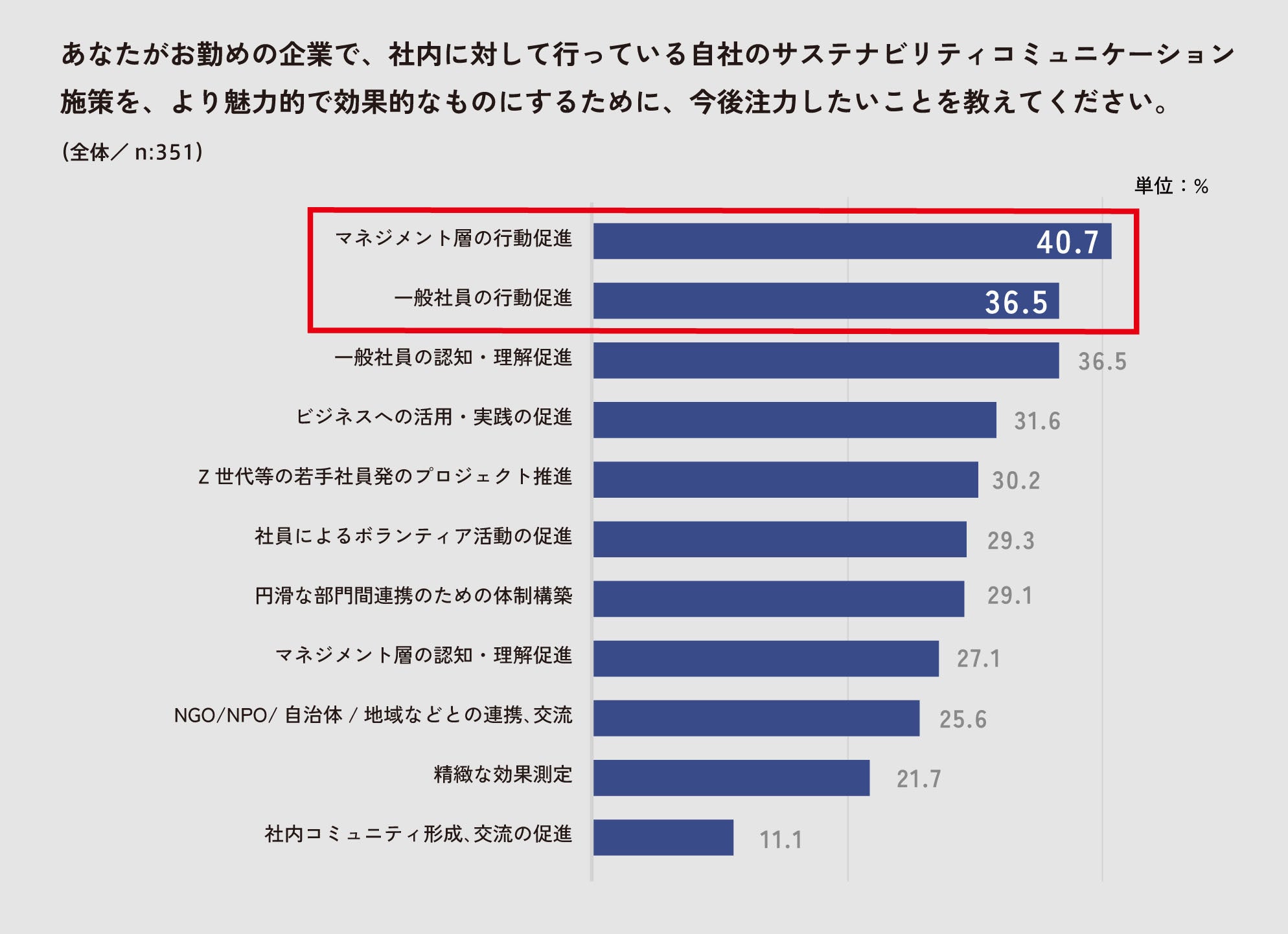 社内向けコミュニケーションを、より魅力的で効果的なものにするために重視したいことTOP3は、「マネジメント層の行動促進(40.7%)」、「一般社員の行動促進(36.5%)」、「一般社員の認知・理解促進(36.5%)」と、マネジメント層から一般社員まで幅広く「行動促進」を重視している。