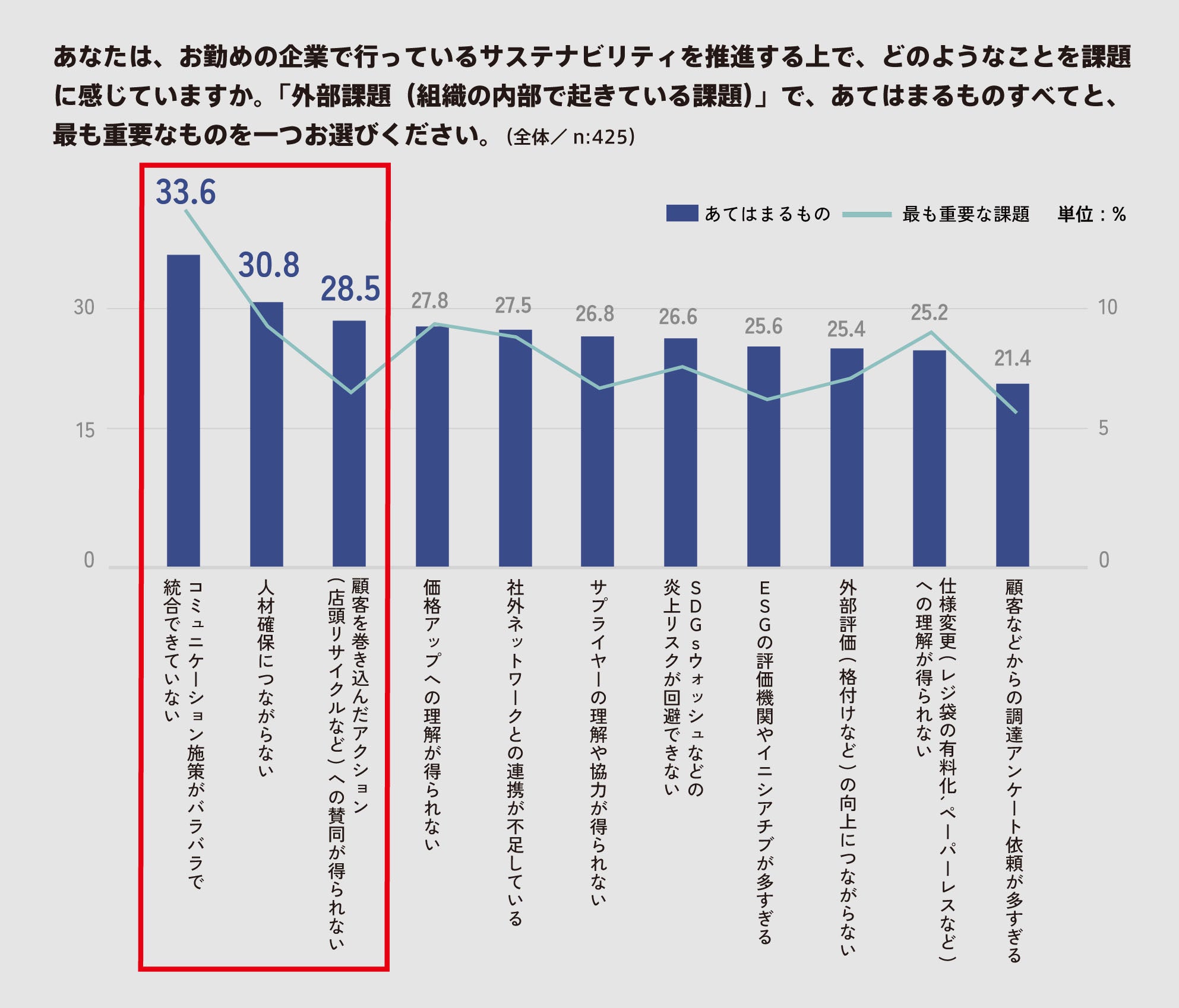 外部課題TOP3は、1位「コミュニケーション施策がバラバラ(33.6%)」、2位「人材確保につながらない(30.8%)」、3位「顧客を巻き込んだアクションへの賛同が得られない(28.5%)」。社内において様々な部署が関わるサステナビリティ推進における各施策がバラバラに実施されているため、取り組みの魅力がストーリーとして十分伝わらず、顧客を巻き込んだアクションや人材確保につながらない状況を生み出していると考えられる。