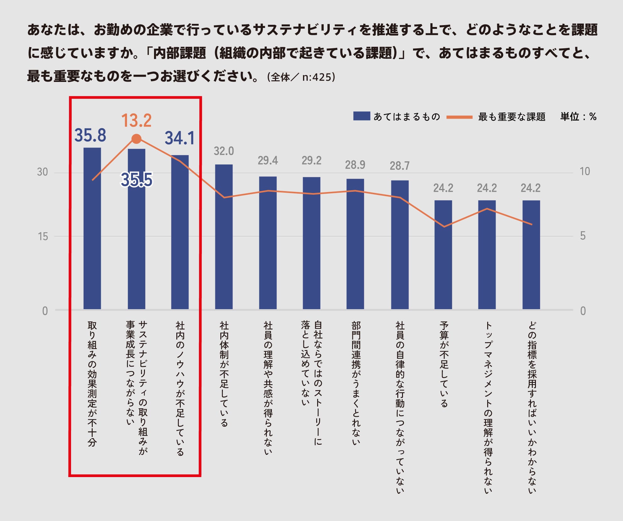 内部課題TOP3は、1位「取り組みの効果測定が不十分(35.8%)」、2位「取り組みが事業成長につながらない(35.5%)」、3位「社内のノウハウが不足(34.1%)」。最も重要な内部課題は、「取り組みが事業成長につながらない(13.2%)」であることから、事業への統合が大きな課題となっていることがわかった。また、サステナビリティ専門部署に所属する層が、他部署で推進する層と比較して、内部課題を強く感じる傾向がある。