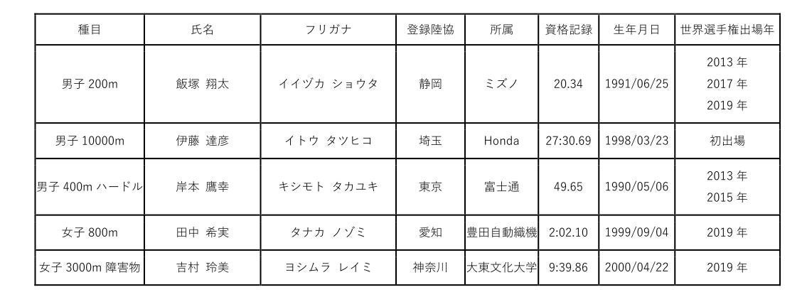 2022年7月15日(金)~24日(日)に開催される「オレゴン2022世界陸上競技選手権大会」に派遣する日本代表選手につきまして、ワールドアスレティックスによる出場資格者の追加を受け、新たに以下の選手が日本代表に決定しましたことをお知らせいたします。