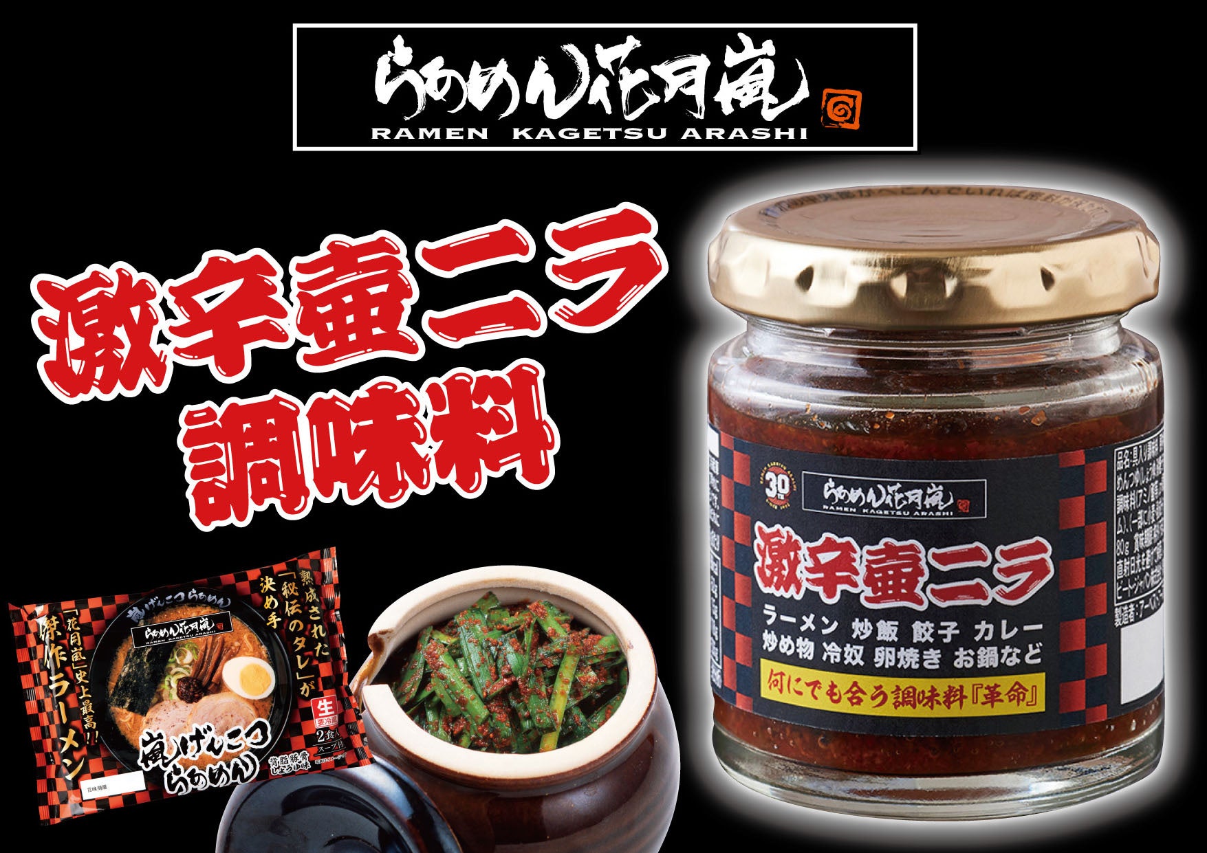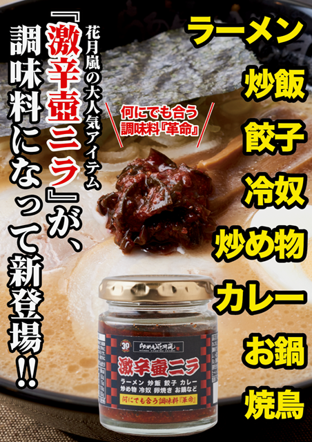 グロービート・ジャパン(株)(本社:東京都杉並区)は、ラーメンチェーン「らあめん花月嵐」の卓上調味料「激辛壺ニラ」を、ご家庭でも楽しんでいただけるように「激辛壺ニラ調味料」として商品化しました。本商品は、現在多くのスーパーや楽天市場・アマゾン・ヤフーショッピングでも販売されております。