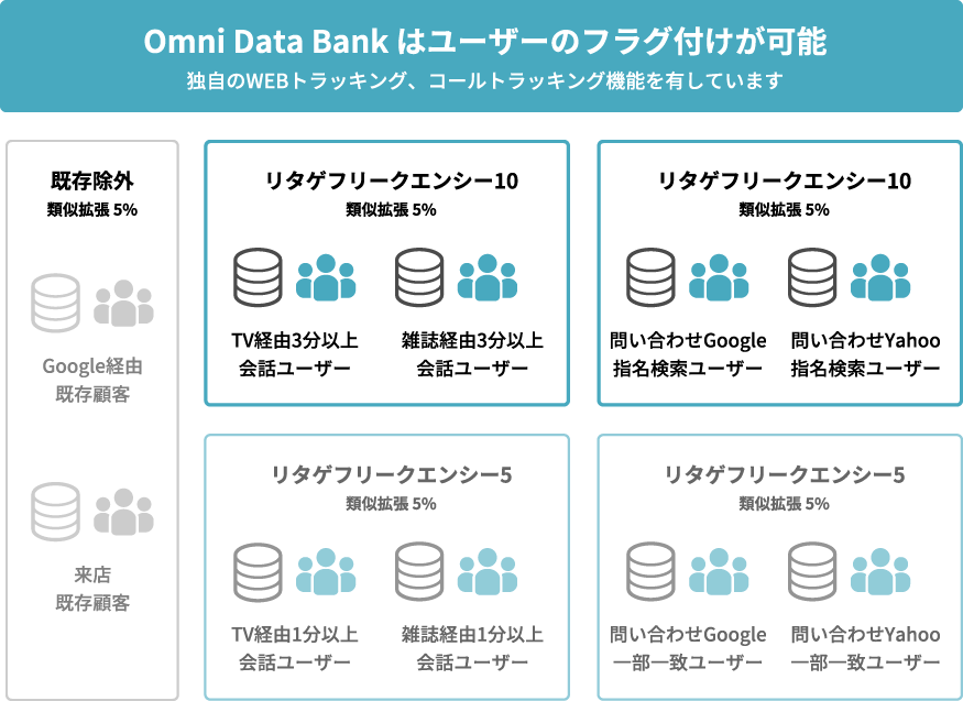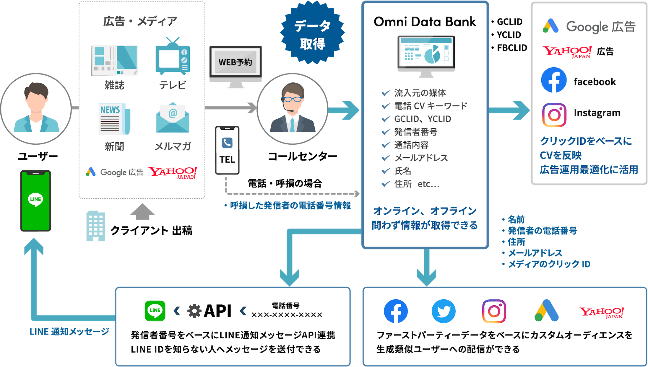 オムニデータバンクでは独自技術によりコールデータやメールアドレスなどを収集する事が可能になり、追加開発を行う事なく、様々なメディアと連携する事が出来ます。