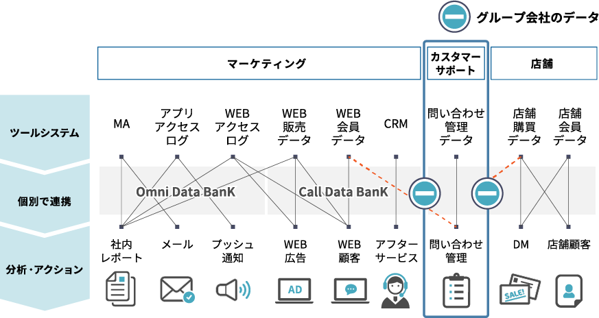 顧客データがあっても部署ごとにデータ形式や管理の方法が異なっている企業もあります。「オムニデータバンク」であれば、その様なケースでもデータを全て自動で収集して統合管理できます。