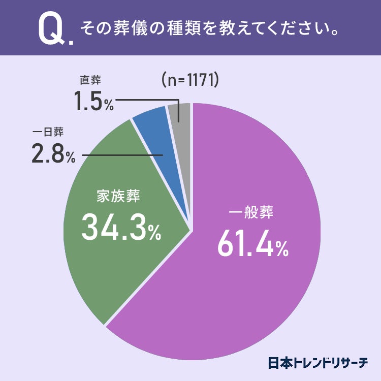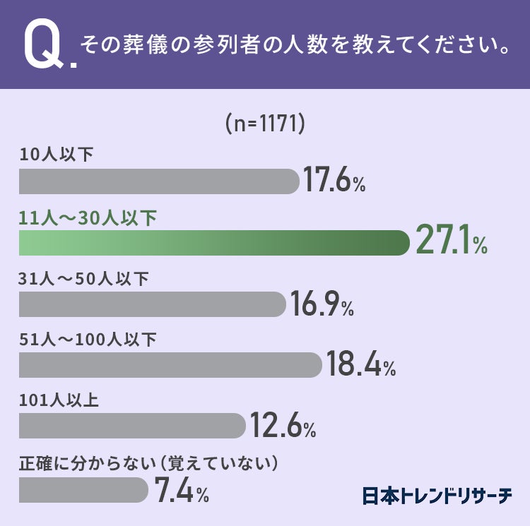 「一般葬」が61.4%で、参列者は「11人~30人以下」が27.1%という結果になりました。