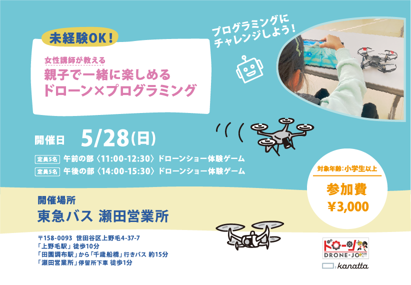 ドローンを活用したプログラミング体験会は、2023年5月28日(日)に東急バス株式会社の瀬田営業所にて開催します。