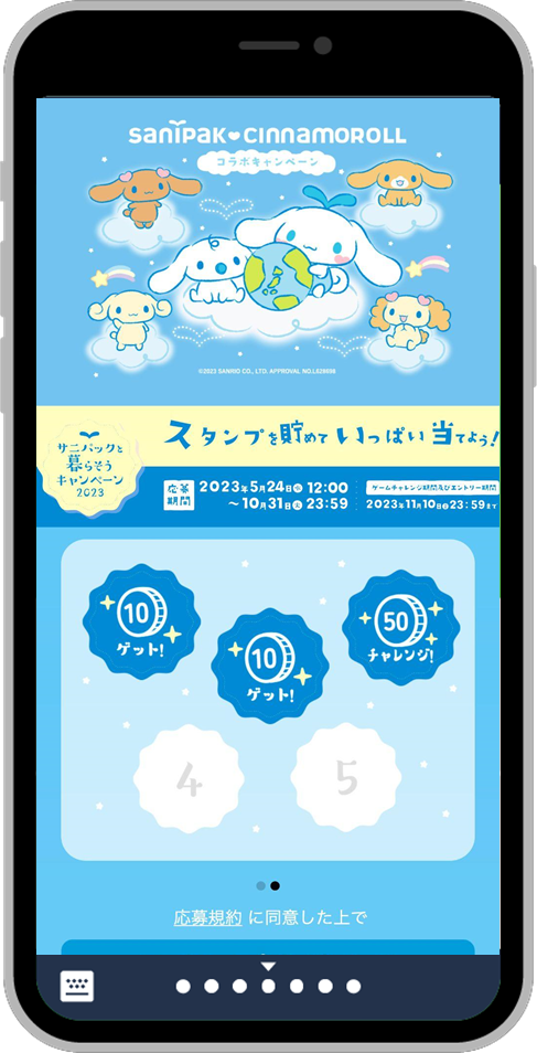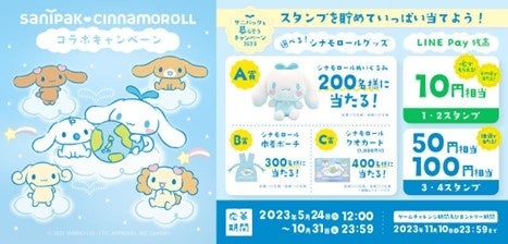 「サニパックと暮らそうキャンペーン2023」は、専用のLINEミニアプリから日本サニパックが提供するゴミ袋やポリ袋等の商品バーコードと購入レシートを読み取ることでスタンプがたまり、LINE Pay残高やシナモロール オリジナルグッズ等がもらえるキャンペーンです。