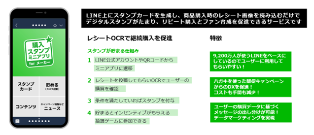 「購入スタンプミニアプリ for メーカー」は、スタンプカード機能を持つLINEミニアプリを簡単に提供できるサービスで、メーカー企業様の販促キャンペーンDXを促進します。