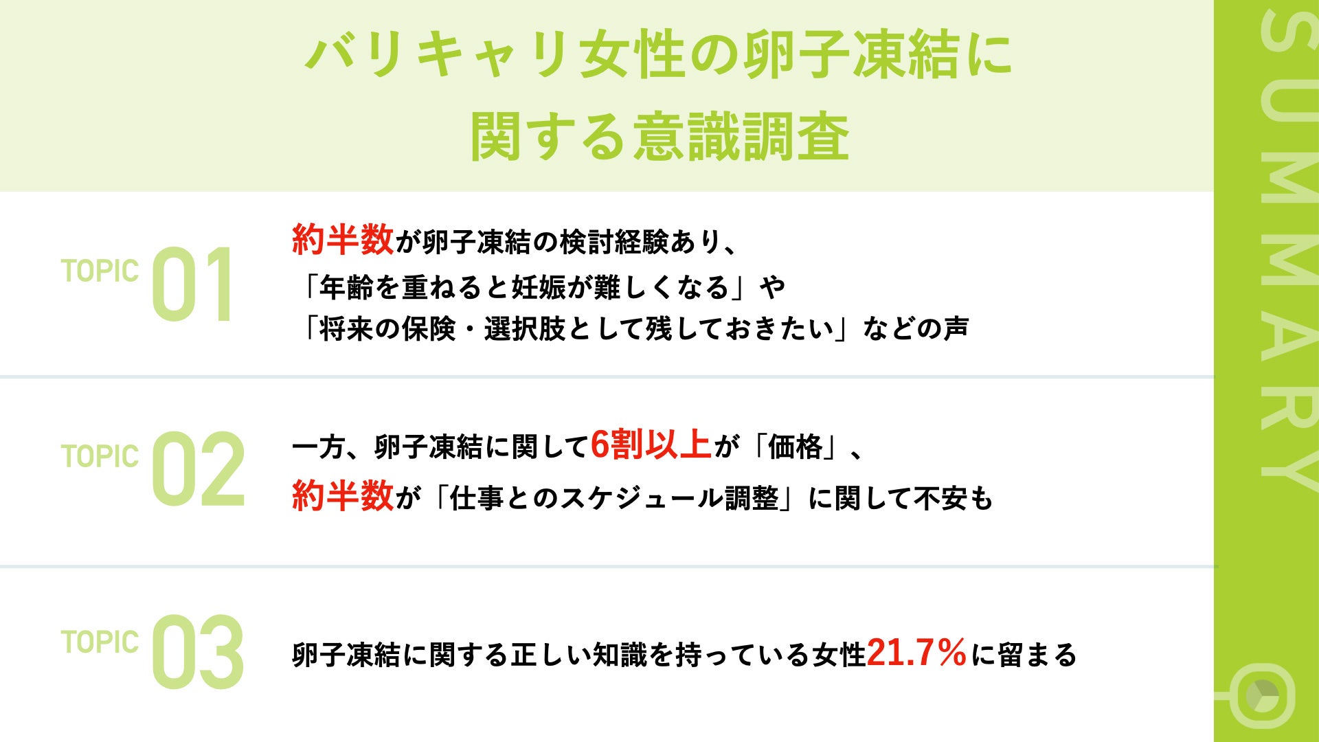 約半数のバリキャリ女性が、「年齢を重ねると妊娠が難しくなる」や「将来の保険・選択肢として残しておきたい」などといった理由から、自身の未授精卵子を凍結する「卵子凍結」という選択肢を1回でも考えたことがあるということが判りました。一方で、「価格が高い」や「仕事とのスケジュール調整」などといった卵子凍結への不安を持っていることも明らかになりました。卵子凍結に関する正しい知識を持っていないと回答した女性は8割以上となり、メディアなどを通して「卵子凍結」に関する情報は多くあるものの、情報の正しさについての判断は難しい状況にあるようです。