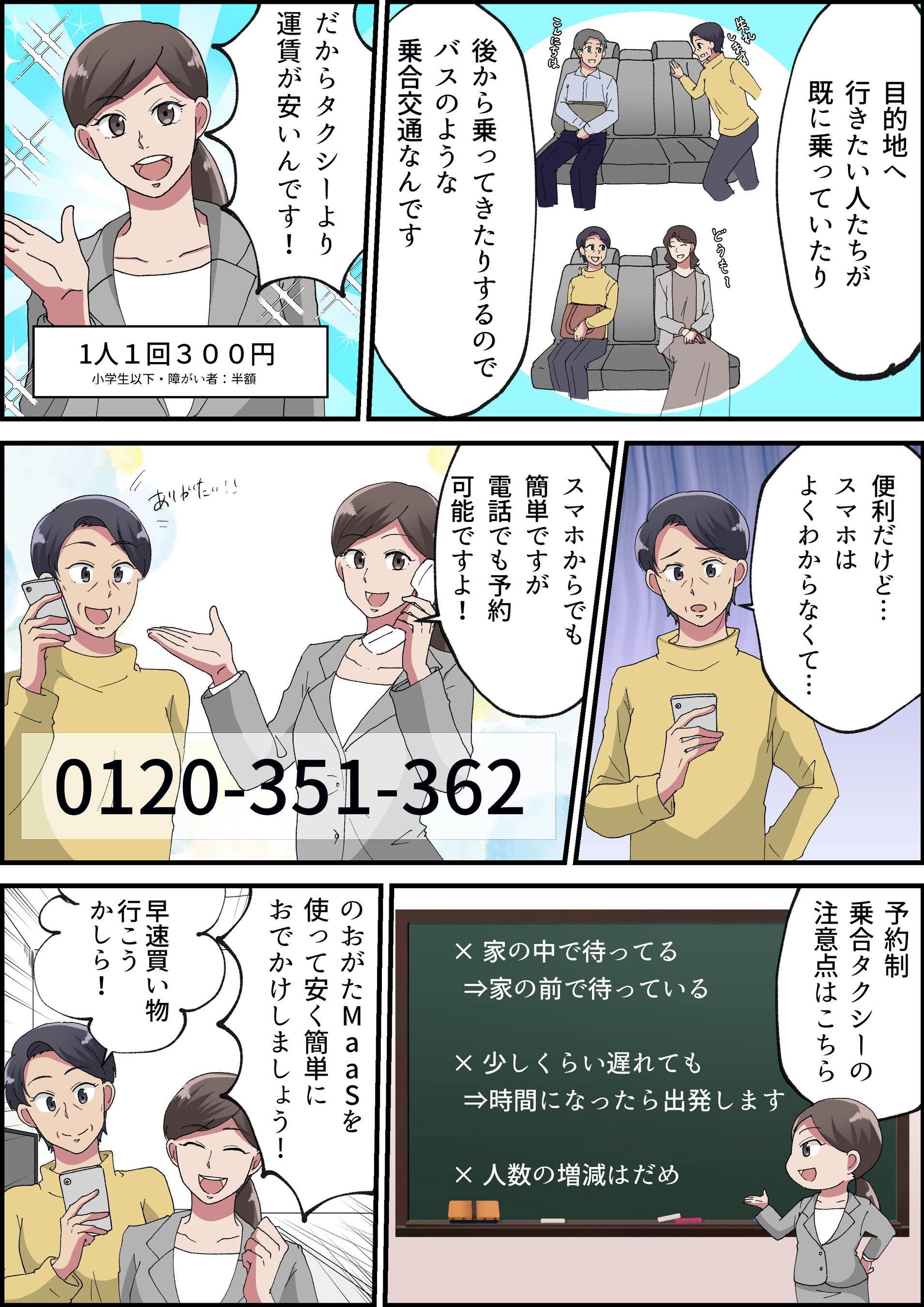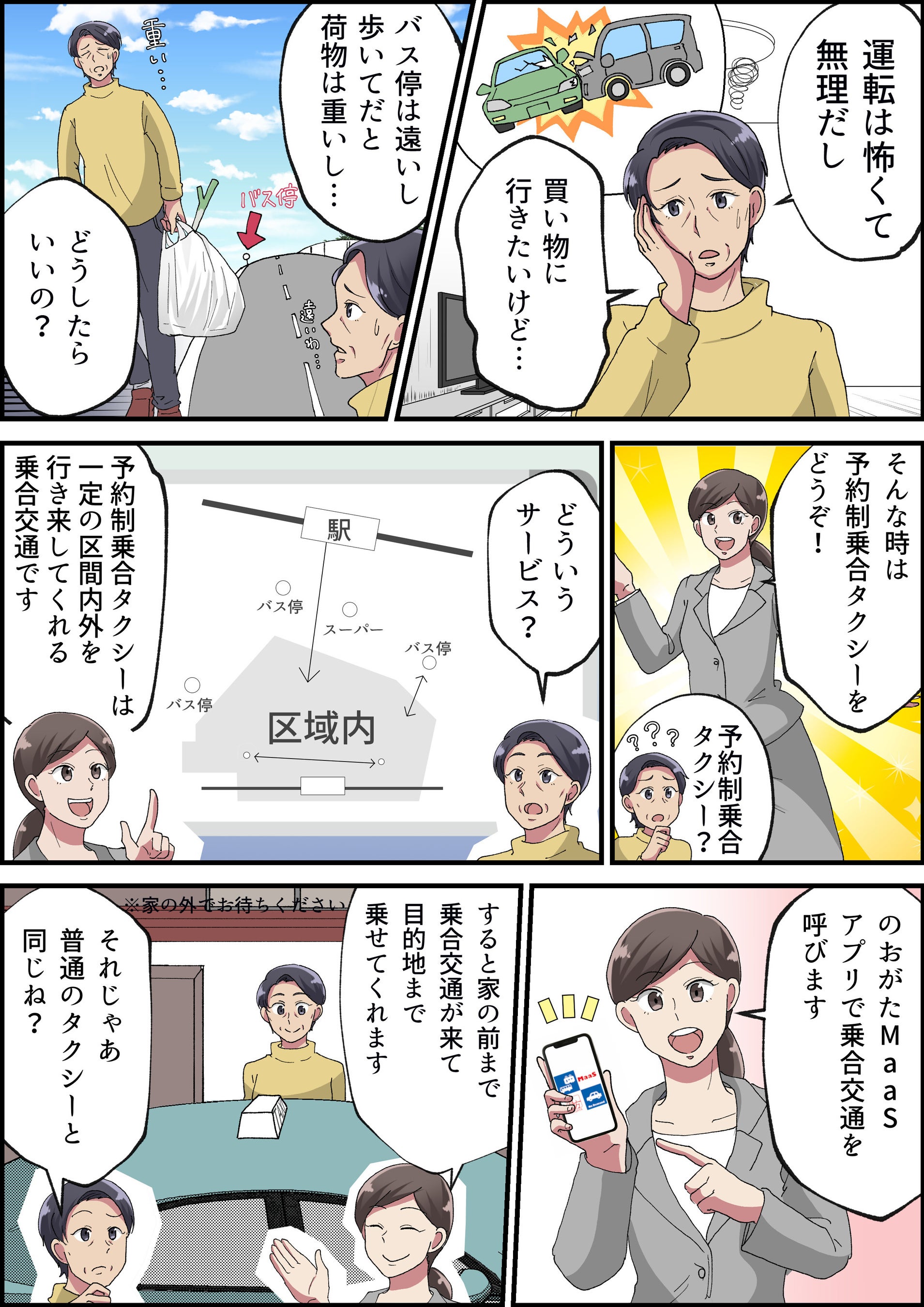 MaaSとは、鉄道や路線バスなどの交通手段の情報をまとめて、アプリや電話から検索、予約を行うサービスのことです。