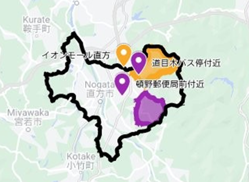 利用者はエリア内で乗降場所を自由に設定し、予約が入るとAIが複数利用者を輸送するのに効率的な運行ルートを判断して、乗合のタクシーを運行します。利便性を考慮して、上頓野エリアではイオンモール直方を出発地、目的地にも出来ます。畑・永満寺エリアでは、道目木バス停付近、頓野郵便局前付近を出発地・目的地にすることもでき、既存バス路線への乗り継ぎに繋げます。