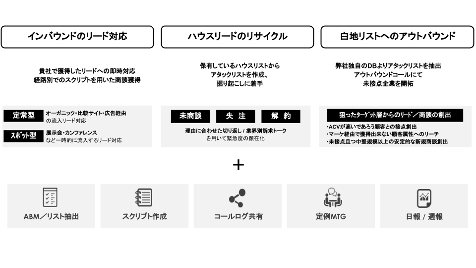 この度、数多くの企業様から頂いた声をもとにサービスを再設計し、アウトバウンドでの支援だけでなく、顧客獲得領域全般(インバウンドリードの対応・ハウスリードのリサイクル・白地へのアウトバウンド)に対応範囲を広げた。