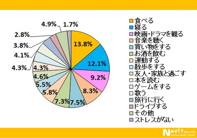 どうやってストレスを発散するかについては、総回答数(複数回答可)の13.8%が「食べる」と回答しています。
