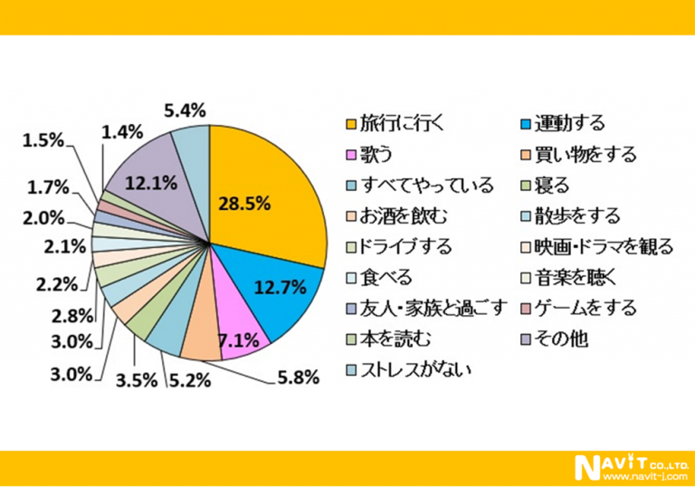 やってみたいストレス発散法で一番多いのは「旅行に行く」で、28.5%。「運動する」12.7%、「歌う」7.1%などがこれに続いています。