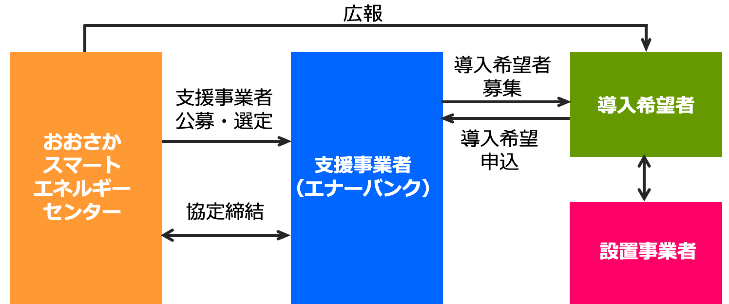 当社は大阪府との協定に基づき、導入希望者の募集、申込受付、設置事業者(PPA事業者等)の選定、導入希望者と設置事業者のマッチングを実施いたします。