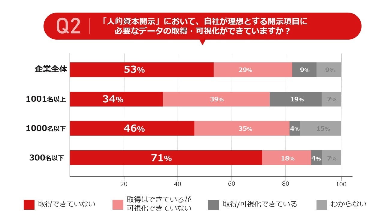 企業全体のうち、「人的資本開示」において、自社が理想とする開示項目に必要なデータの「取得ができていない」企業は53%となり、データの「取得はできているが、可視化できていない」企業は29%となりました。一方で、データの「取得/可視化ができている」企業は9%に留まっています。
