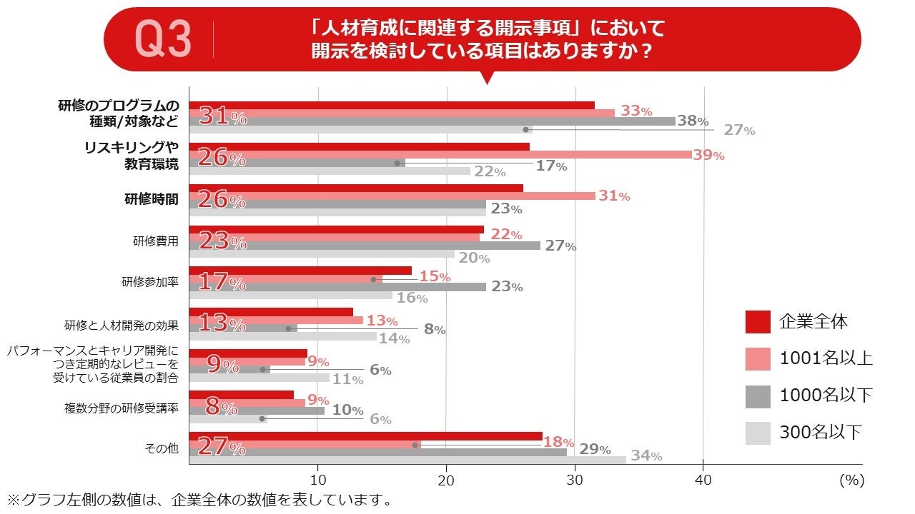 企業全体のうち、「人材育成に関連する開示事項」で最も開示を検討している項目は「研修プログラムの種類/対象など」で31%、次いで「リスキリングや教育環境」と「研修時間」がそれぞれ26%となりました。