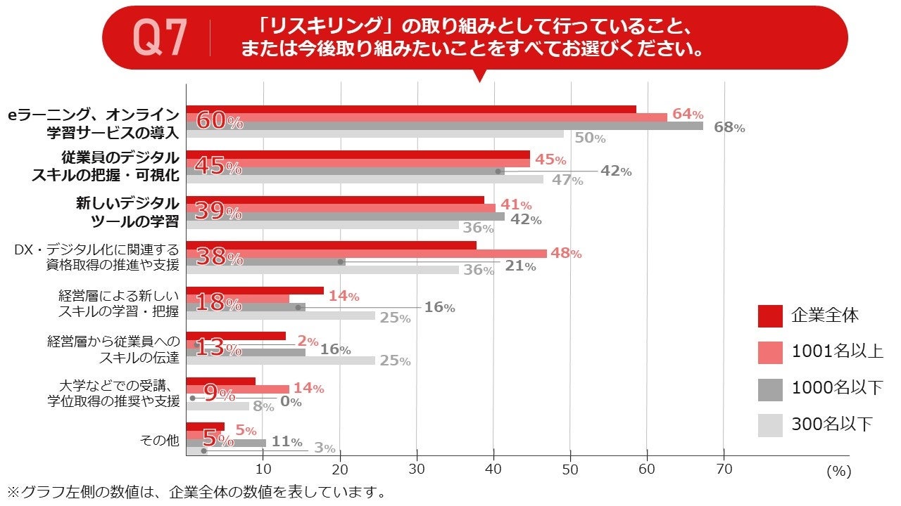 企業規模別の比較では、大きな相違はありませんでしたが、1001名以上では「eラーニング、オンライン学習サービスの導入」に続いて「DX・デジタル化に関連する資格取得の推進や支援」が2番目に多く48%となりました。