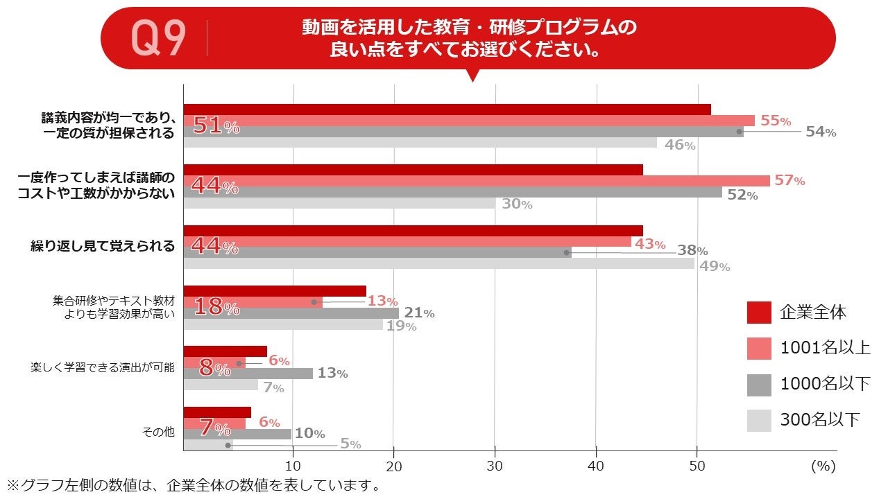 企業全体では、動画を活用した教育・研修プログラムの良い点として、「講義内容が均一であり、一定の質が担保される」が51%と最も高く、次いで「一度作ってしまえば講師のコストや工数がかからない」が44%、「繰り返し見て覚えられる」も44%となりました。また、企業規模別においては、企業規模毎の大きな相違は見られませんでした。