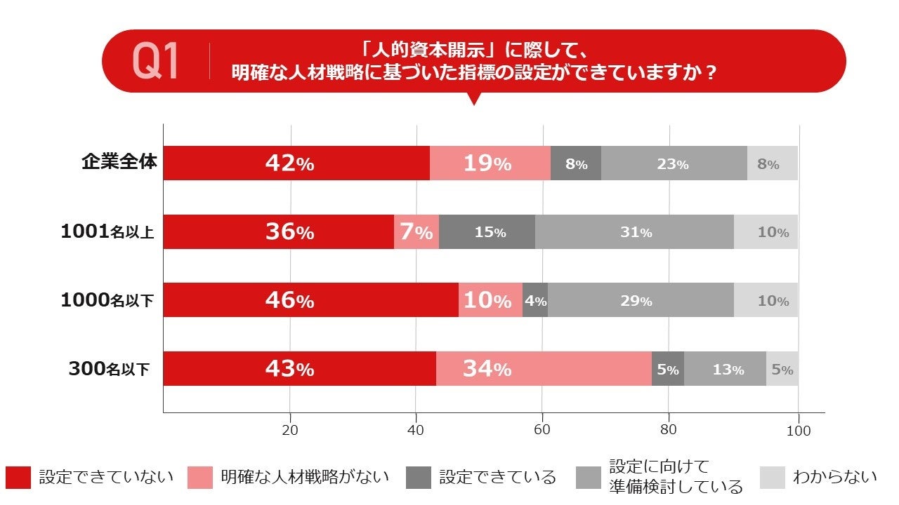 企業規模別では、そもそも「明確な人材戦略がない」300名以下の企業は、1001名以上の企業(7%)の約4.9倍である34%となっています。また、人材戦略に基づいた指標の「設定ができている」1001名以上の企業が15%に対して、301〜1000名の企業は4%、300名以下の企業は5%となりました。