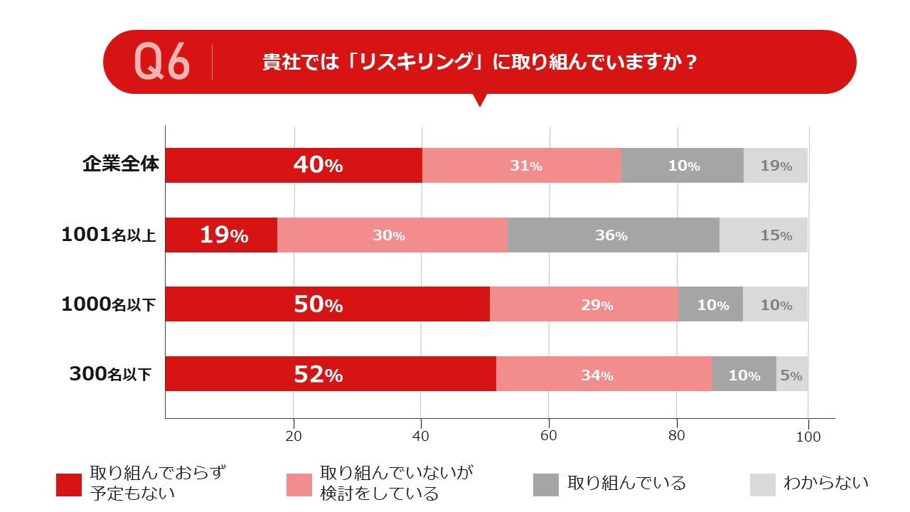 企業全体では、「リスキリング」に取り組んでいる企業は19%に留まり、40%の企業が「取り組んでおらず予定もない」ことが明らかになりました。また、31%の企業は「取り組んでいないが検討をしている」と回答しました。