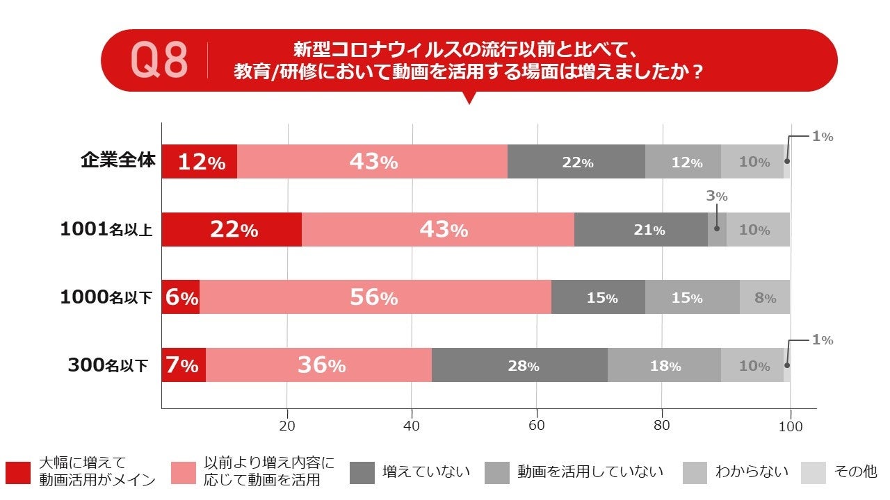 企業規模別に見ると、「大幅に増えて、動画での教育・研修がメインになっている」と回答した300名以下の企業は7%に留まりました。一方で、1001名以上の企業では約3.4倍となる22%であることが明らかとなっています。