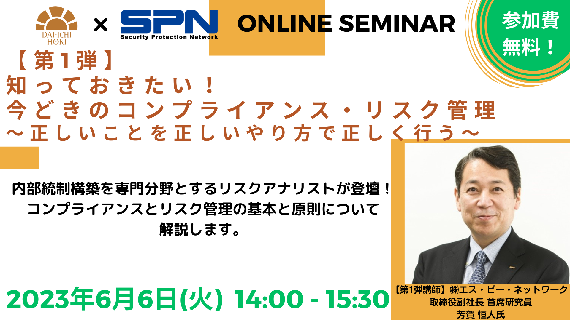 第1弾では株式会社エス・ピー・ネットワーク 取締役副社長 首席研究員である芳賀 恒人氏にご登壇いただき、コンプライアンスとリスク管理の基本と原則についてご講演いただきます。