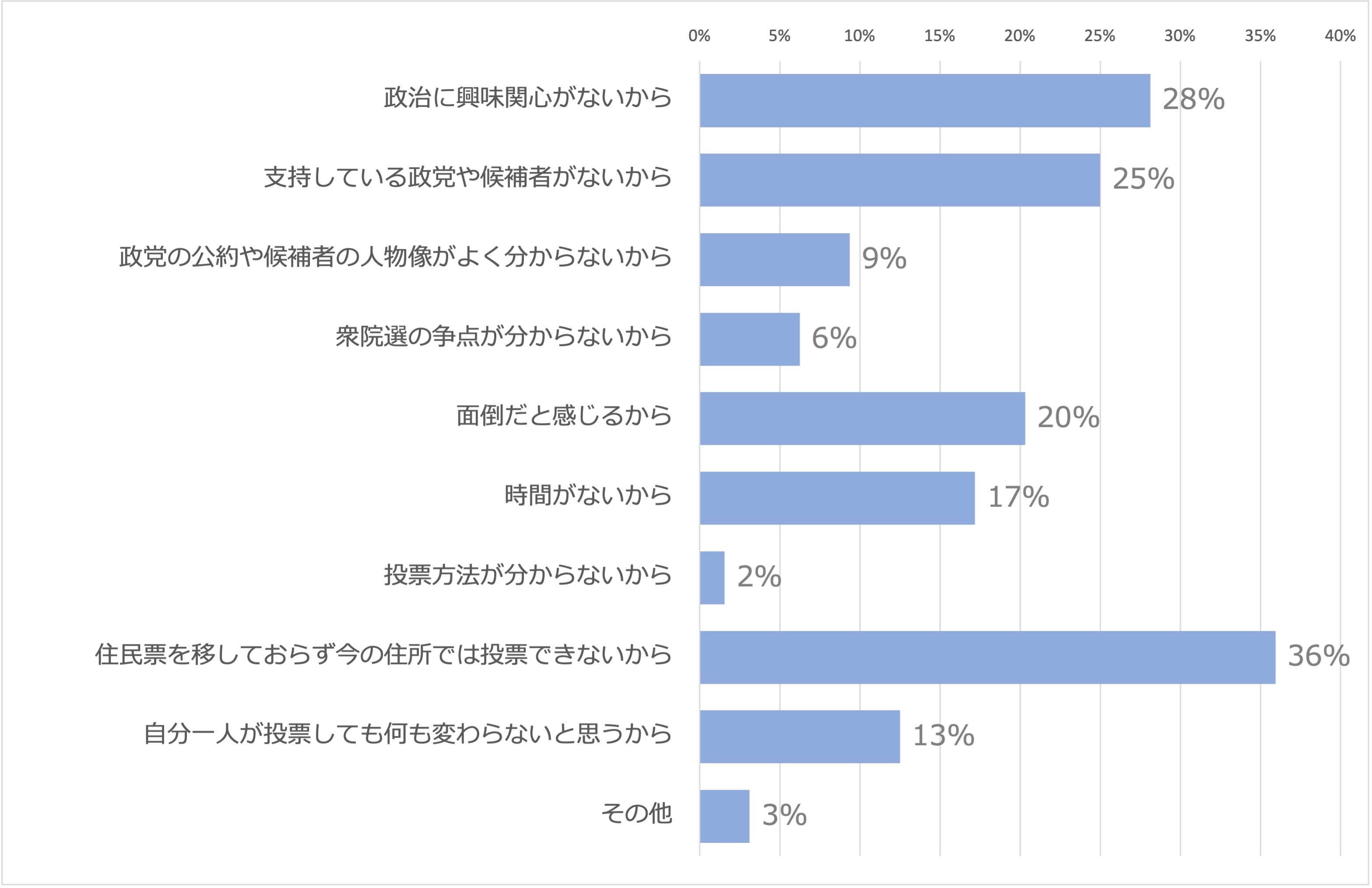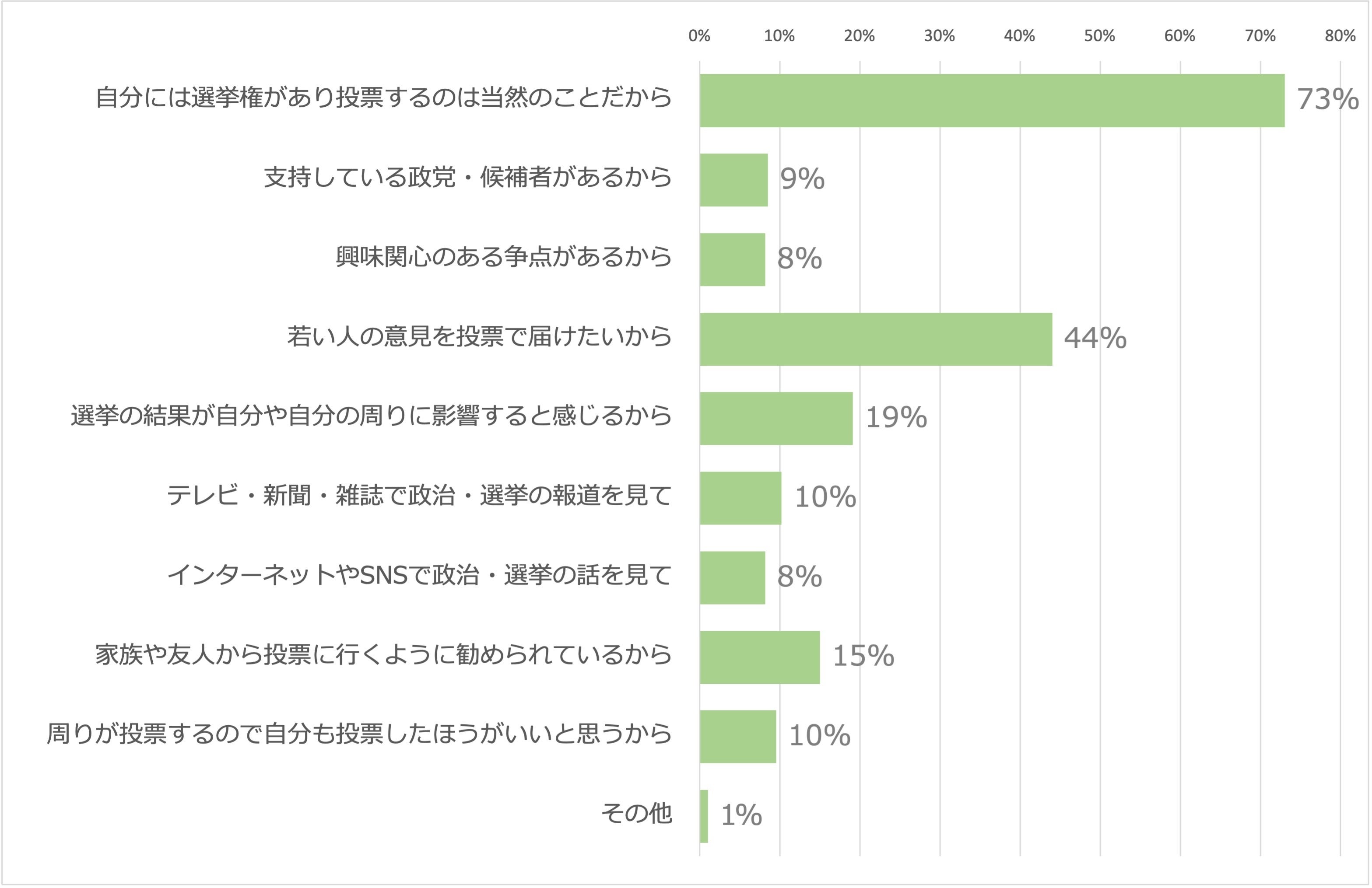 一方「若い人の意見を投票で届けたい(44%)」、「選考の結果が自分や自分の回りに影響すると感じているから(19%)」、「支持している政党・候補者があるから(9%)」といった、自らの考えを持ち日本をより良くするために、主体的に選挙に参加する意見はまだまだ少なく感じた。