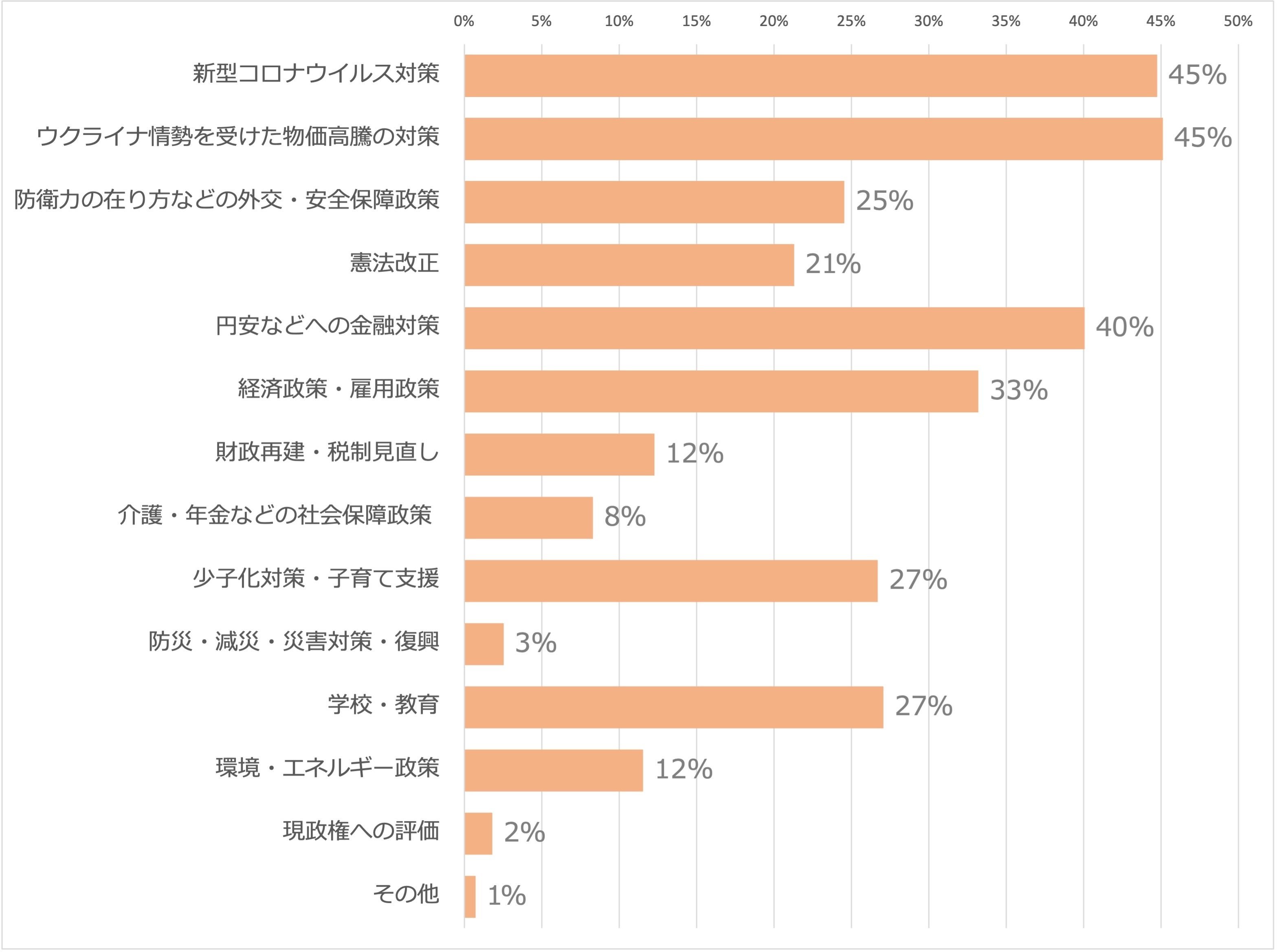 そのうえで、「Q6.今回の参院選では物価高、外交・安全保障、憲法改正、新型コロナ対策などが主な争点と言われています。特に興味関心のある争点はありますか?(n=454)」という質問をした。