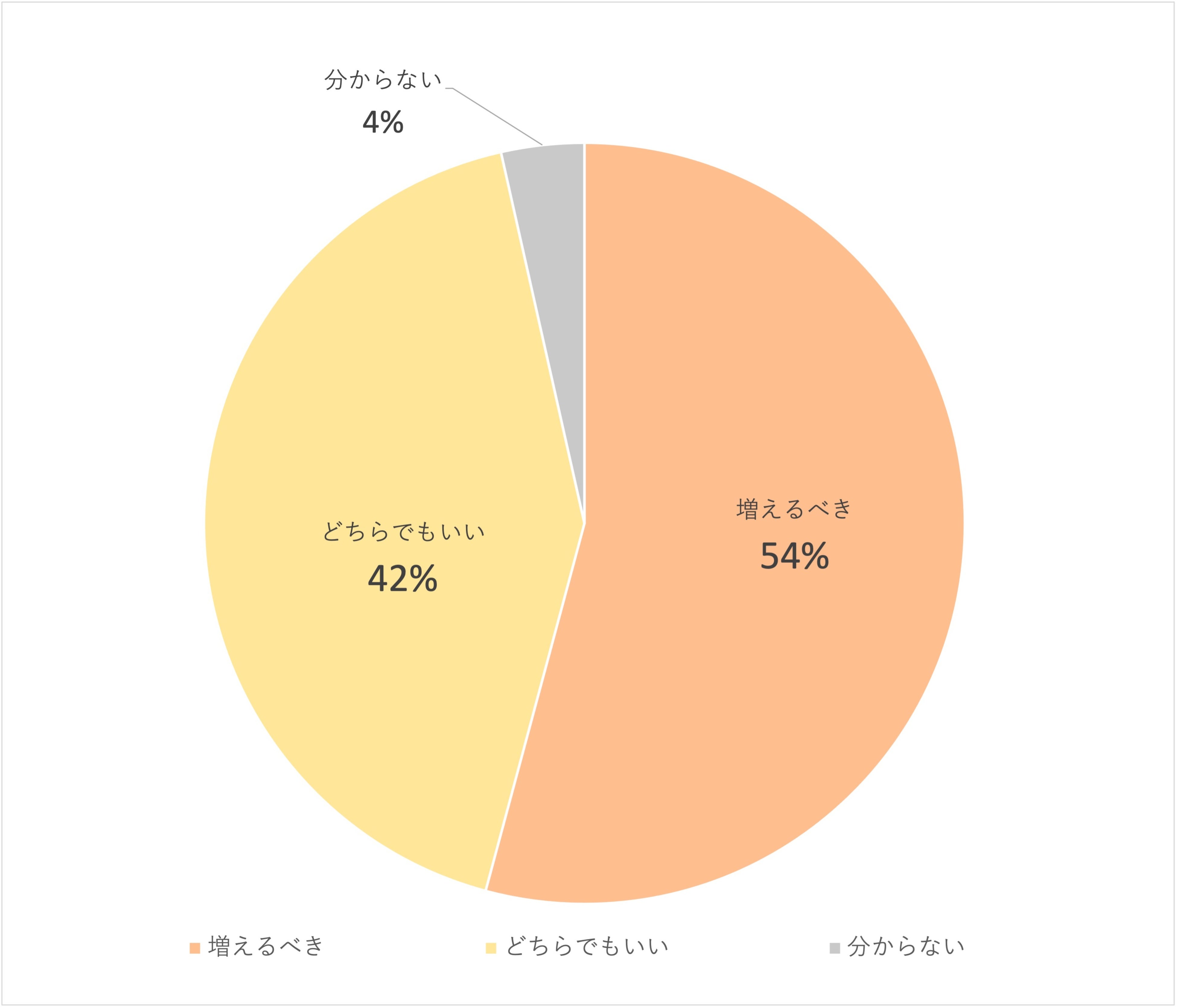 増えるべきと回答した方が54%、どちらでもいいと回答した方が42%、分からないと回答した方が4%であった。