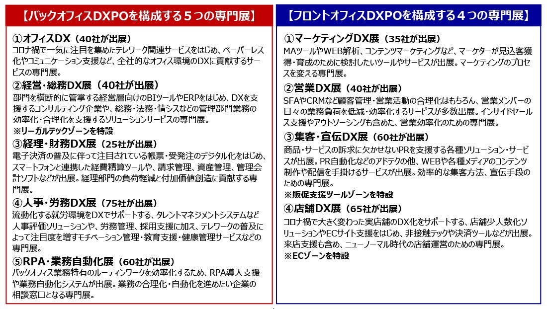 前半2日間開催(2022年8月23日[火]・24日[水])の「バックオフィスDXPO」は、製品(サービス)ジャンル毎に、下記5つの専門展示会で構成され、オフィス環境のDXから、管理部門特有の各種ルーティンワークや総務・経理・人事部門の業務効率化・自動化を支援する注目のDX製品(サービス)が一堂に出揃う。