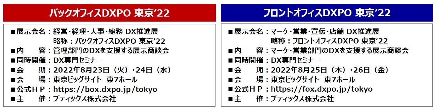 商談型展示会事業とM&A仲介事業を展開するブティックス株式会社(東京都港区、代表取締役社長 新村祐三、東証グロース上場 証券コード:9272)は、企業の業務改革・DX推進をテーマとした2つの展示会、「経営・経理・人事・総務DX推進展」(略称:バックオフィスDXPO東京)と、「マーケ・営業・宣伝・店舗DX推進展」(略称:フロントオフィスDXPO東京)を、今年8月、東京ビッグサイトにて盛大に開催する。また本展は通年開催の「オンライン展示会」とのハイブリッド(リアル+オンライン)開催となり、出展社数は2展合計で440社を数え、初開催ながら、本分野日本最大級の商談型展示会となる。(注)DXPO(読み:ディーエクスポ)は、「DX+EXPO」の造語。「展示会をDXする」という意味を込めて同社が命名したサービス名