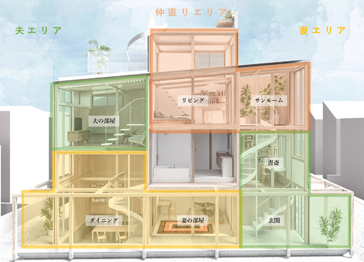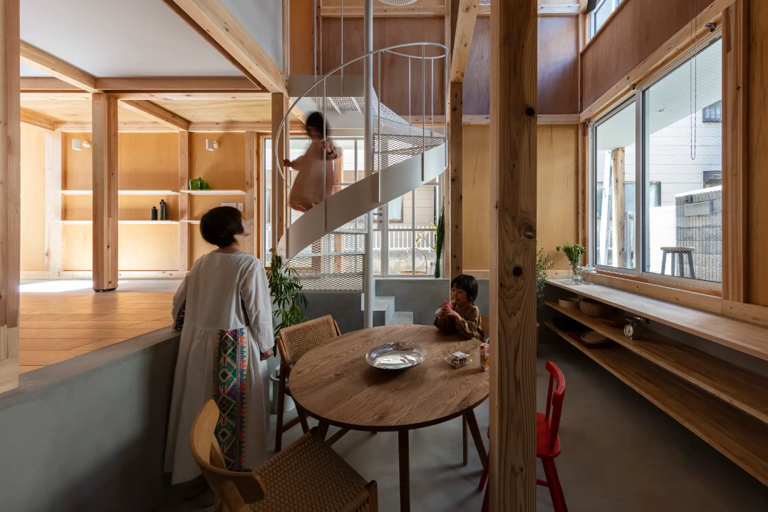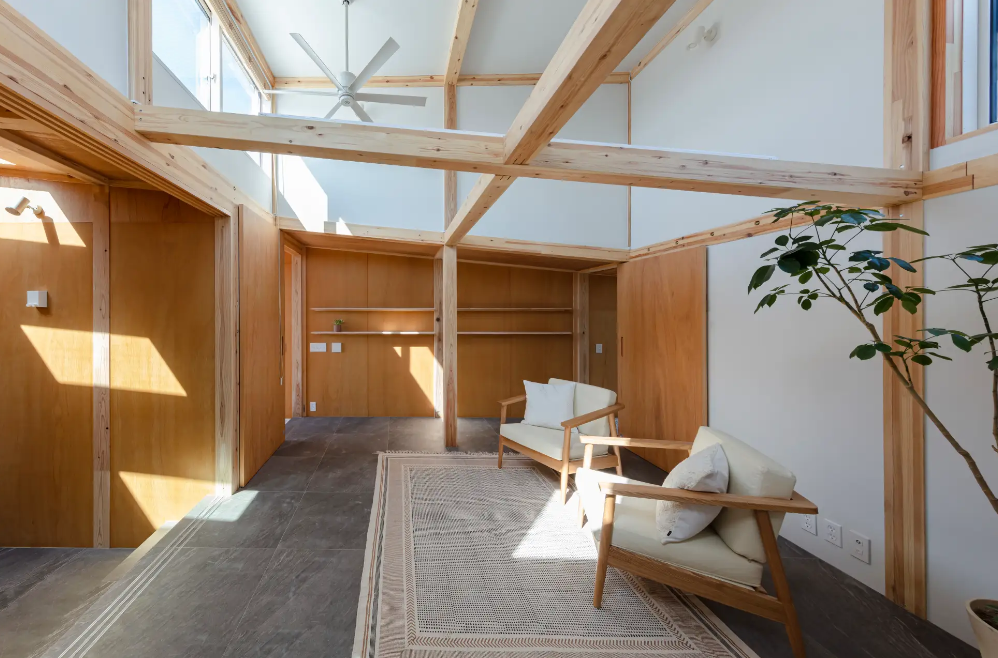 「ニセカイジュウタク」はひとつ屋根の下に玄関と階段が2つずつあり、2つの世界観を持っていることが大きな特徴となっています。その使い分けは、仕事とプライベートや親世代と子世代、妻と夫など様々な用途に対応が可能です。また、梁や柱の木をあえて露出させることで、木のぬくもりに包まれるようなあたたかな住宅を表現しています。