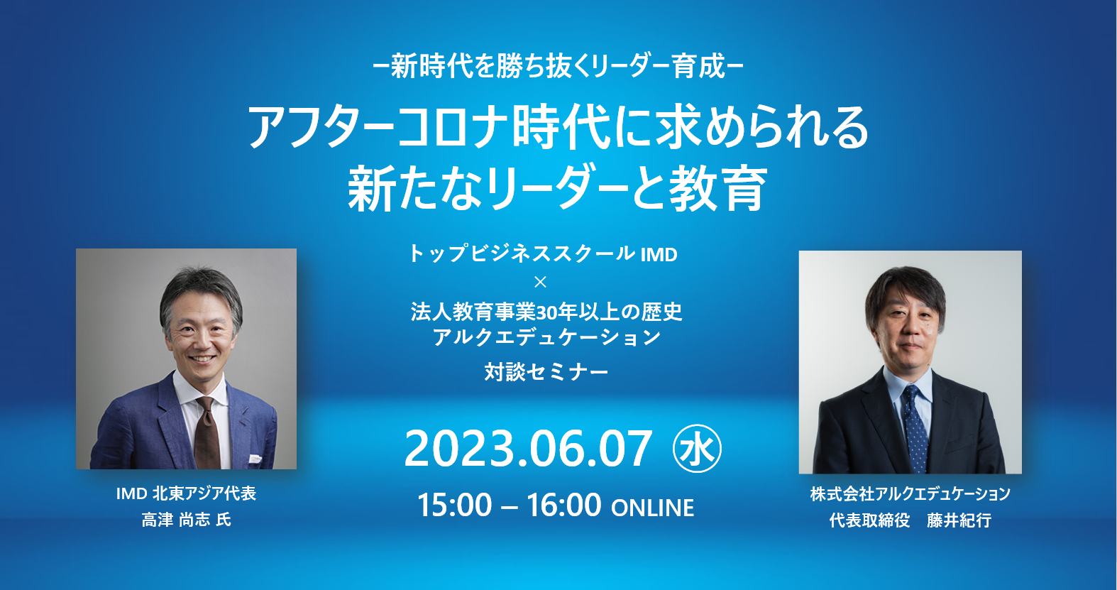 今回、スイス、ローザンヌに拠点を置き世界有数のビジネススクールIMD北東アジア代表である、高津尚志氏をお招きし、アルクエデュケーション代表取締役の藤井と「アフターコロナ時代に求められるリーダーとその教育」について対談形式でのセミナーを開催します。