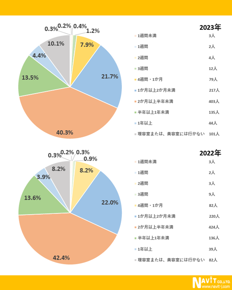 昨年度の42.4%より2.1%減少しましたが、美容室に通う頻度は「2ヶ月以上半年未満」が40.3%で一番多かったです。