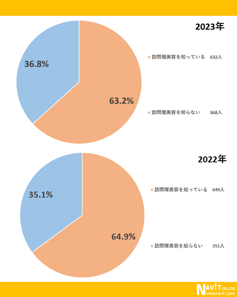 「訪問理美容を知っている」という方が63.2%で「訪問理美容を知らない」という方が36.8%となっています。昨年の調査では知っている方が64.9%、知らないという方が35.1%ということで、ほぼ横ばいの認知度と言っていいでしょう。