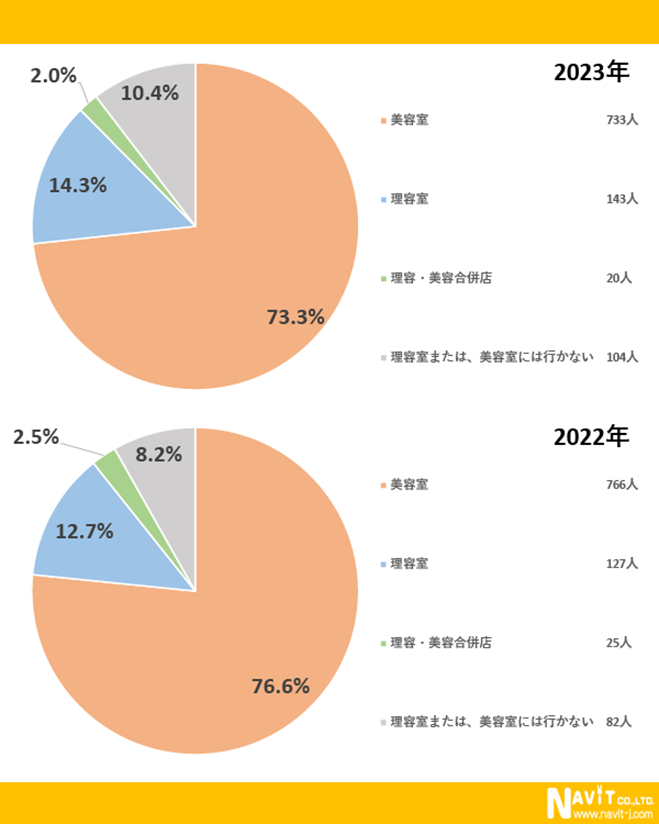 このアンケートでは「美容室」と答えた方が圧倒的に多いです。今年度のアンケートは73.3%ですが、昨年のアンケートでは76.6%だったので3.3%ダウンしています。