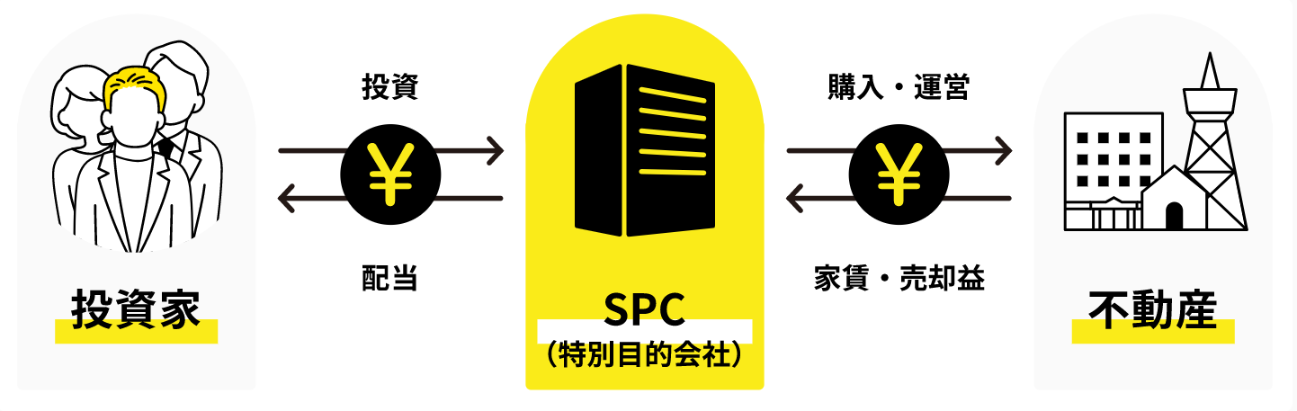 不動産取引を行うことを目的とする特別目的会社(SPC)を設立し、SPCが主体となって投資家と出資契約を締結し集めた資金で不動産を購入し、賃料等の収益を投資家に分配する仕組みです。SPCスキームでは、それぞれの業務を第3号事業者、第4号事業者に外部委託することが可能です。