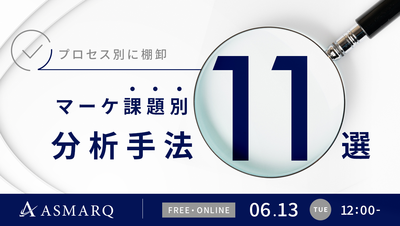 そこで今回はアスマークのリサーチャーが、プロセス・フェーズ毎に「マーケ課題」「リサーチ手法」「分析手法」を棚卸し、一覧整理した「対応表」を基に事例と共に解説いたします。セミナー終了後は対応表もDL頂けますので、この機会に、課題別の調査方法~分析手法までを今一度再理解頂けましたら幸いです。
