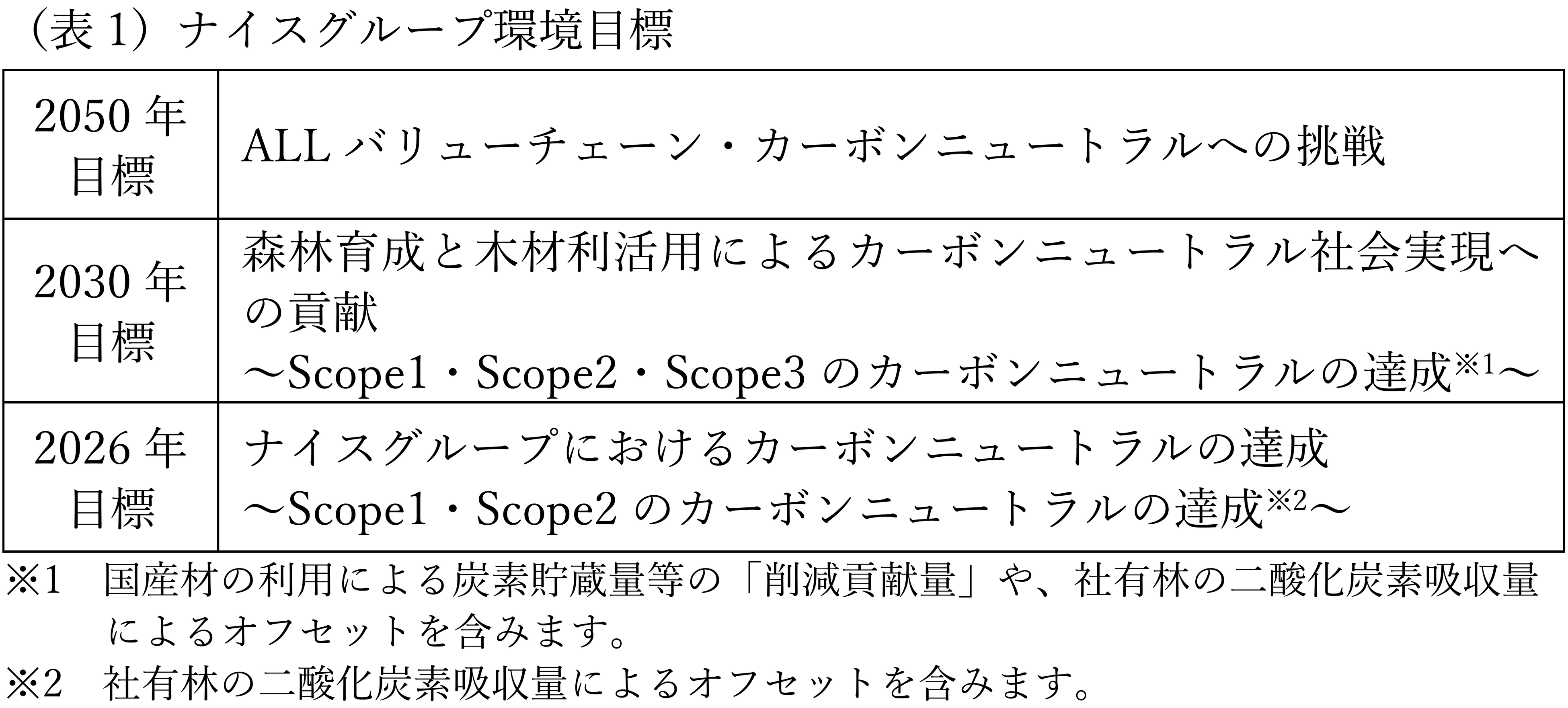 当社は引き続き、省エネ活動の推進と再エネの積極的な利用に加え、社有林「ナイスの森」の保全育成を通じた二酸化炭素吸収量の増大を図ることなどにより、マテリアリティ(重要課題)の一つである「事業活動 における環境負荷の低減」の取り組みを推進してまいります。