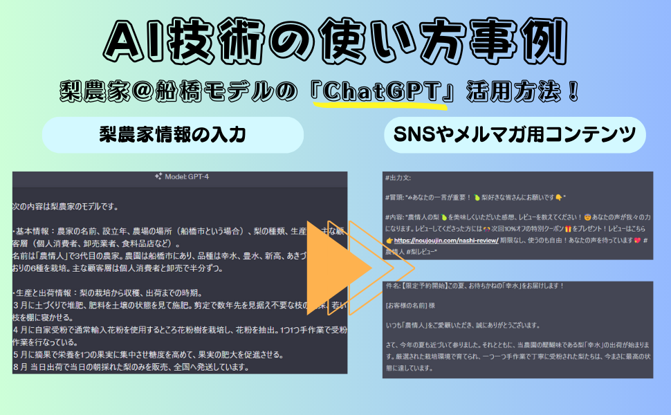 具体的なAI技術の活用事例として、梨農家をモデルとしてプロンプト文と共に紹介しています。