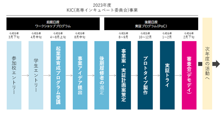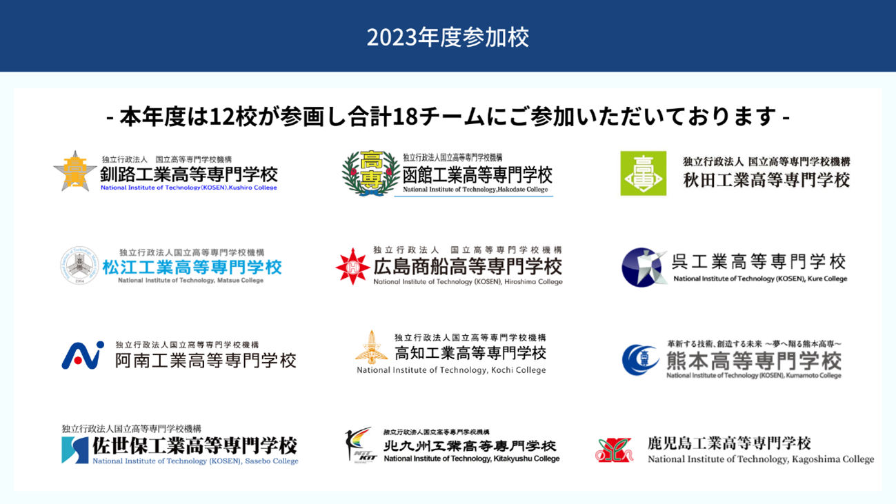 「KIC事業」は、設立初年度である昨年の大きな反響と実績を受け、2023年度プログラムへのエントリーを2023年3月より開始しました。昨年度に続き大きな反響をいただいており、2023年度プログラムにおいては昨年度から大きく増加し、全国から12校の高等専門学校が参画し、合計18チームの参加が決定いたしました。